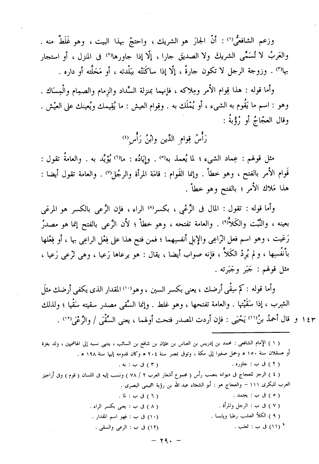 وزعم الشافعي: أن الجار هو الشريك، واحتاج بهذا البيت، وهو غلط منه. والعرب لا تسمي الشريك ولا الصديق جارا، إلا إذا جاورها في المنزل، أو استجار بها. وزوجة الرجل لا تكون جارة، إلا إذا ساكنته ببلدته، أو محلته أو داره.