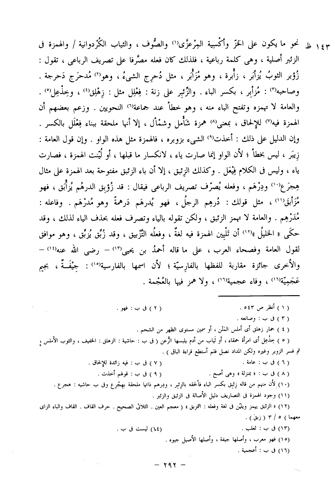 نحو ما يكون على الخز وأكسية المرعزي والصوف، والثياب الكردوانية/ والهمزة في الزئبر أصلية، وهي كلمة رباعية، فلذلك كان فعله مصرفا على تصريف الرباعي، تقول: زئبر الثوب يزأبر، زأبرة، وهو مزأبر، مثل دحرج الشيء، وهو مدحرج دحرجة. وصاحبه: مزأبر، بكسر الباء. والزئبر على زنة، فعلل مثل: زهلق، وخذعل. والعامة لا تهمزه وتفتح االباء منه، وهو خطأ عند جماعة النحويين. وزعم بعضهم أن الهمزة فيه للإلحاق، بمعنى همزة شأمل وشمأل، إلا أنها ملحقة ببناء فعلل بالكسر. وإن الدليل على ذلك: أخذت الشيء بزوبره، فالهمزة مثل هذه الواو. وإن قول العامة: زيبر، ليس بخطأ؛ لأن الواو إنما صارت ياء، لانكسار ما قبلها، أو لينت الهمزة، فصارت ياء، وليس في الكلام فيعل. وكذلك الزئبق، إلا أن باء الزئبق مفتوحة بعد الهمزة على مثال هجرع ودرهم، وفعله يصرف تصريف الربااعي فيقال: قد زؤبق الدرهم يزأبق، فهو مزأبق، مثل قولك: درهم الرجل، فهو يدرهم درهمة وهو مدرهم. وفاعله: مدرهم. والعامة لا تهمز الزئبق، ولكن تقوله بالياء وتصرف فعله بحذف الياء لذلك، وقد حكى "الخليل" أن تليين الهمزة فيه لغة، وفعله التزبيق، وقد زبق يزبق، وهو موافق لقول العامة والصحاء العرب، على ما قاله أحمد بن يحيى- رضي الله عنه- والأخرى جائزة مقاربة للفظها بالفارسية؛ لأن اسمها بالفارسية: جيفة، بجيم عجمية، وفاء عجمية، ولا همز فيها بالعجمة.
