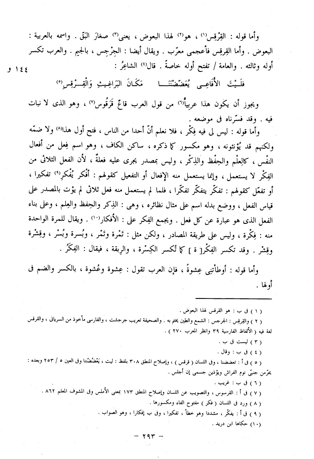 وأما قوله: القرقس، هو لهذا البعوض، يعني صغار اللبق. واسمه بالعربية: البعوض. وأما القرقس فأعجمي معرب. ويقال أيضا: الجرجس، بالجيم. والعرب تكسر أوله وثالثه. والعامة/ تفتح أوله خاصة. قال الشاعر: