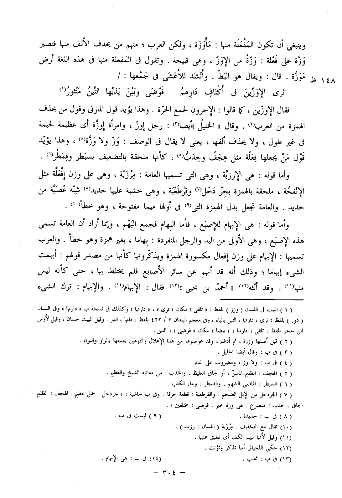 فقال الإوزين، كما قالوا: الإحرون لجمع الحرة. وهذا يؤيد قول المازني وقول من يحذف الهمزة من العرب. وقال "الخليل" أيضا: رجل إوز، وامرأة إوزة أي عظيمة لحيمة في غير طول، ولا يحذف ألفها، يعني لا يقال في الوصف: وز ولا وزة، وهذا يؤيد قول من يجعلها فعلة مثل هجف وخدب، كأنها ملحقة بالتضعيف بسبطر وقمطر.