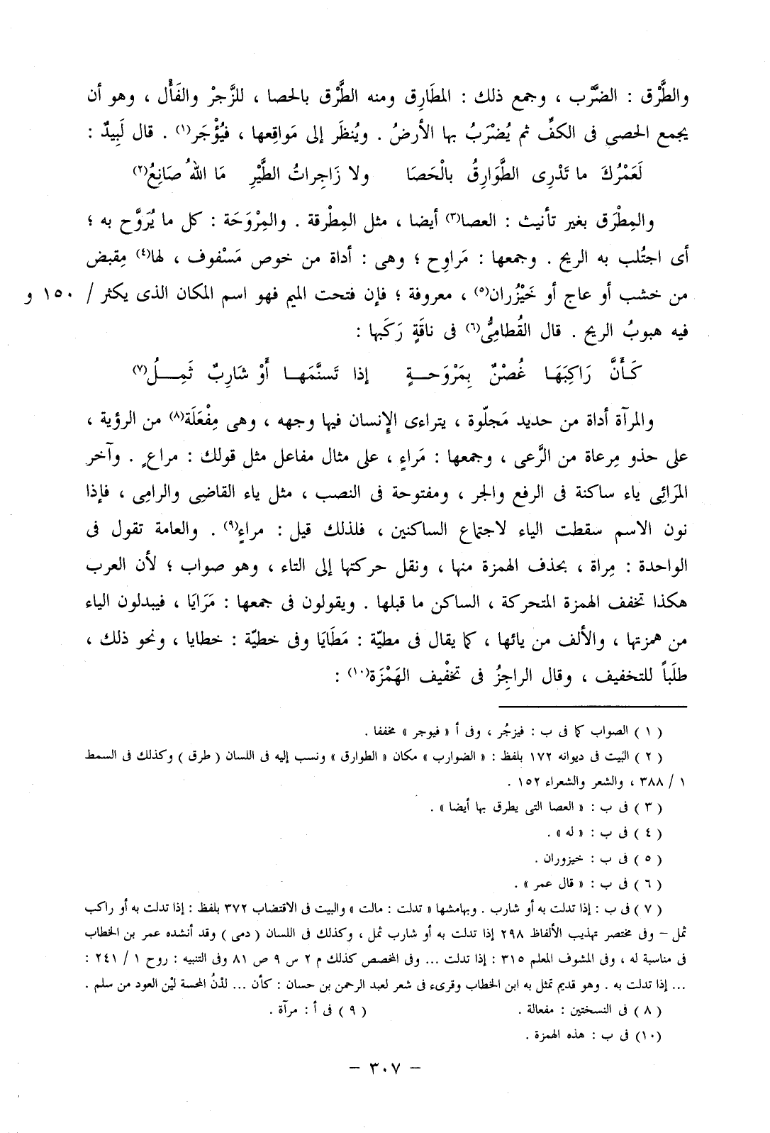 والمرآة أداة من حديد مجلوة، يتراءى الإنسان فيه وجهه، وهي مفعلة من الرؤية، على حذو مرعاة من الرعي، وجمعها: مراء، على مثال مفاعل مثل قولك: مراع. وآخر المرائي ياء ساكنة في الرفع والجر، ومفتوحة في النصب، مثل ياء القاضي والرامي، فإذا نون الاسم سقطت الياء لاجتماع الساكنين، فلذلك قيل: مراء. والعامة تقول في الواحدة: مراة، بحذف الهمزة منها، ونقل حركتها إلى التاء، وهو صواب؛ لأن العرب هكذا تخفف الهمزة المتحركة، الساكن ما قبلها. ويقولون في جمعها: مرايا، فيبدلون الياء من همزتها، والألف من يائها، كما يقال في مطية: مطايا وفي خطية: خطايا، ونحو ذلك، طلبا للتخفيف، وقال الراجز في تخفيف الهمزة: