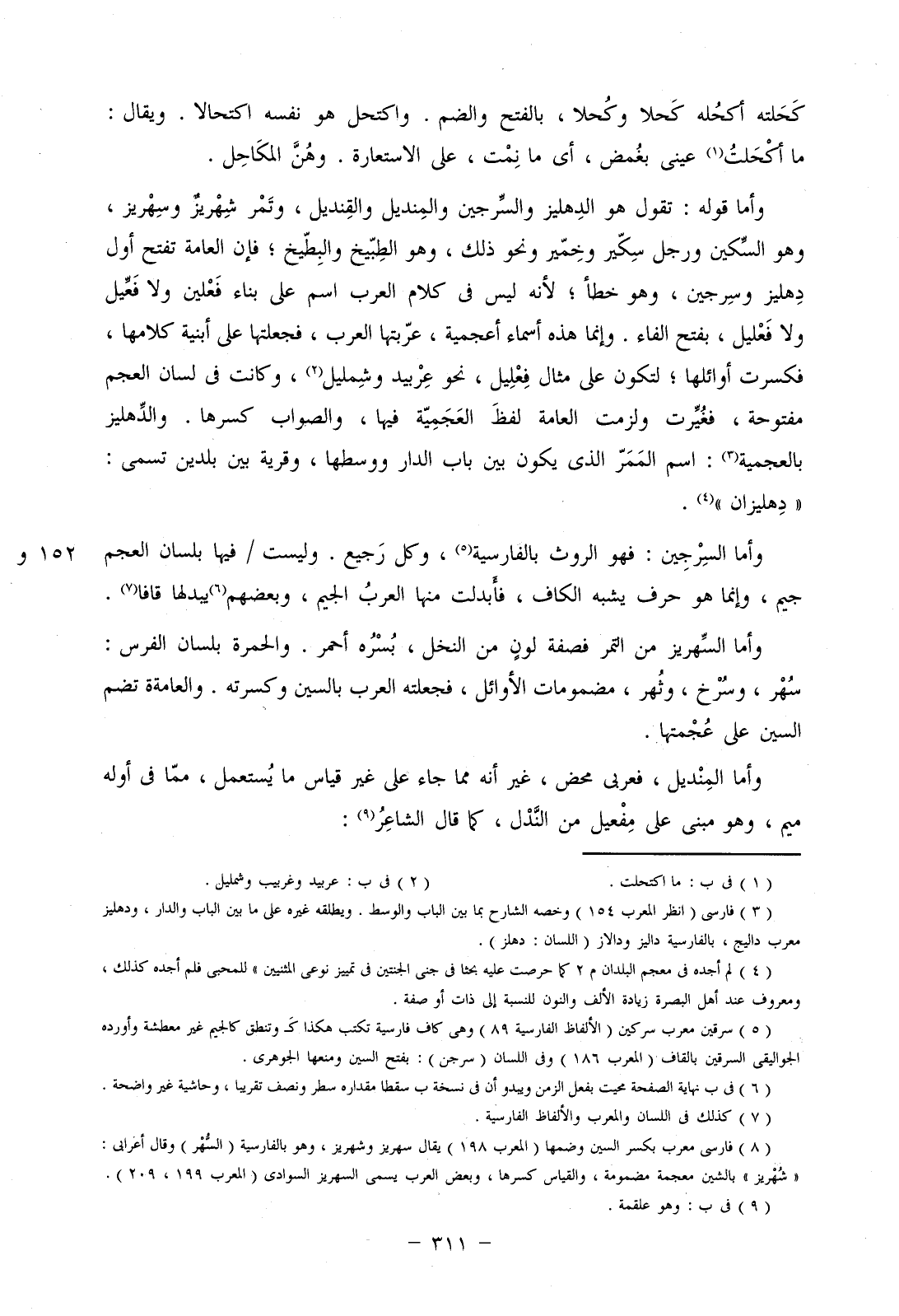 وأما قوله: تقول هو الدهليز والسرجين والمنديل والقنديل، وتمر شهريز وسهريز، وهو السكين ورجل سكير وخمير ونحو ذلك، وهو الطبيخ والبطيخ؛ فإن العامة تفتح أول دهليز وسرجين، وهو خطأ؛ لأنه ليس في كلام العرب اسم على بناء فعلين ولا فعيل ولا فعليل، بفتح الفاء. وإنما هذه أسماء أعجمية، عربتها العرب، فجعلتها على أبنية كلامها، فكسرت أوائلها؛ لتكون على مثال فعليل، نحو عربيد وشمليل، وكانت في لسان العجم مفتوحة، فغيرت ولزمت العامة لفظ العجمية فيها، والصواب كسرها. والدهليز بالعجمية: اسم الممر الذي يكون بين باب الدار ووسطها، وقرية بين بلدين تسمى: "دهليزان".