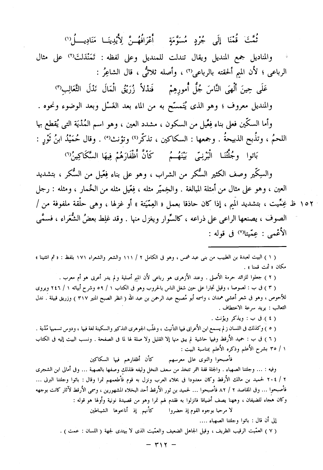 والسكير وصف الكثير السكر من الشراب، وهو على بناء فعيل من السكر، بتشديد العين، وهو على مثال من أمثلة المبالغة. والخمير مثله، فعيل مثله من الخمار، ومثله: رجل عميت، بتشديد الميم، إذا كان حاذاق بعمل "العميتة" أو غزلها، وهي حلقة ملفوفة من/ الصوف، يصنعها الراعي على ذراعه، كالسوار ويغزل منها. وقد غلط بعض الشعراء، فسمى الأعمى: عميتا في قوله: