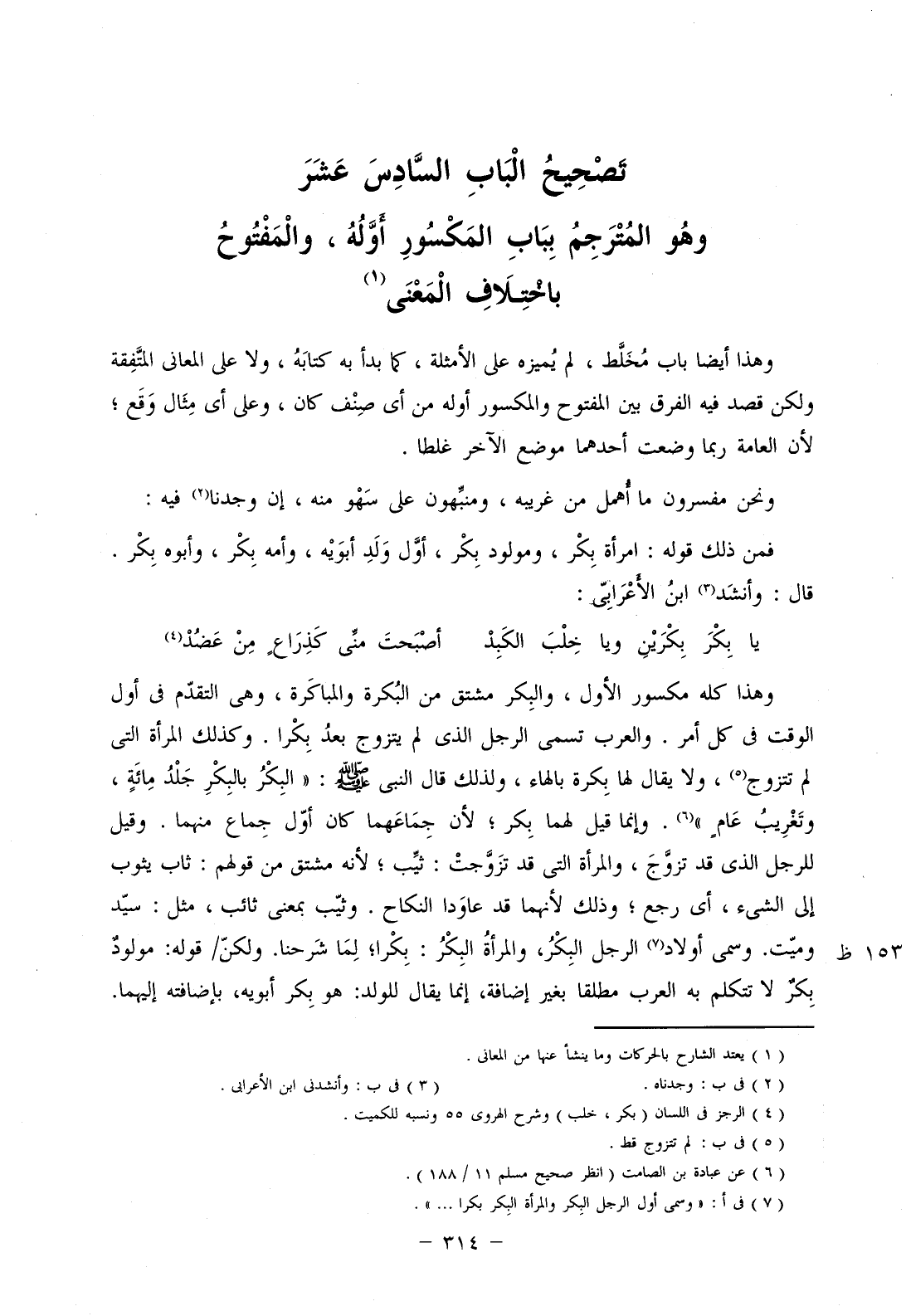 وهذا كله مكسور الأول، والبكر مشتق من البكرة والمباكرة، وهي التقدم في أول الوقت في كل أمر. والعرب تسمي الرجل الذي لم يتزوج بعد بكرا. وكذلك المرأة التي لم تتزوج، ولا يقال لها بكرة بالهاء، ولذلك قال النبي صلى الله عليه وسلم: "البكر بالبكر جلد مائة، وتغريب عام". وإنما قيل لهما بكر؛ لأن جماعهما كان أول جماع منهما. وقيل للرجل الذي قد تزوج، والمرأة التي قد تزوجت: ثيب؛ لأنه مشتق من قولهم: ثاب يثوب إلى الشيء، أي رجع؛ وذلك لأنهما قد عاودا النكاح. وثيب بمعنى ثائب، مثل: سيد وميت. وسمي أولاد الرجل البكر، والمرأة البكر: بكرا؛ لما شرحنا. ولكن/ قوله: مولود بكر لا تتكلم به العرب مطلقا بغير إضافة، إنما يقال للولد: هو بكر أبويه، بإضافته إليهما.