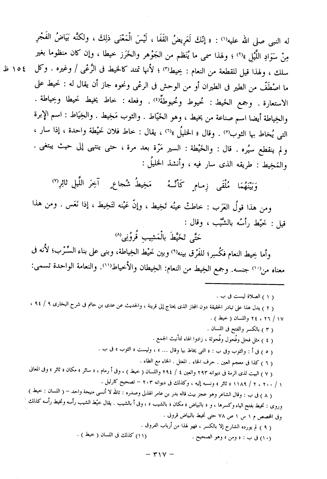 له النبي صلى الله عليه: "إنك لعريض القفا، ليس المعنى ذلك، ولكنه بياض الفجر من سواد الليل"؛ ولهذا سمي ما ينظم من الجوهر والخرز خيطا، وإن كان منظوما بغير سلك، ولهذا قيل للقطعة من النعام: خيط؛ لأنها تمتد كالخيط في الرعي/ وغيره. وكل ما اصطف من الطير في الطيران أو من الوحش في الرعي ونحوه جاز أن يقال له: خيط على الاستعارة. وجمع الخيط: خيوط وخيوطة. وفعله: خاط يخيط خيطا وخياطة. والخياطة أيضا اسم صناعة من يخيط، وهو الخياط. والثوب مخيط. والخياط: اسم الإبرة التي يخاط بها الثوب. وقال "الخليل"، يقال: خاط فلان خيطة واحدة، إذا سار، ولم ينقطع سيره. قال: والخيطة: السير مرة بعد مرة، حتى ينتهي إلى حيث يبتغي. والمخيط: طريقه الذي سار فيه، وأنشد الخليل: