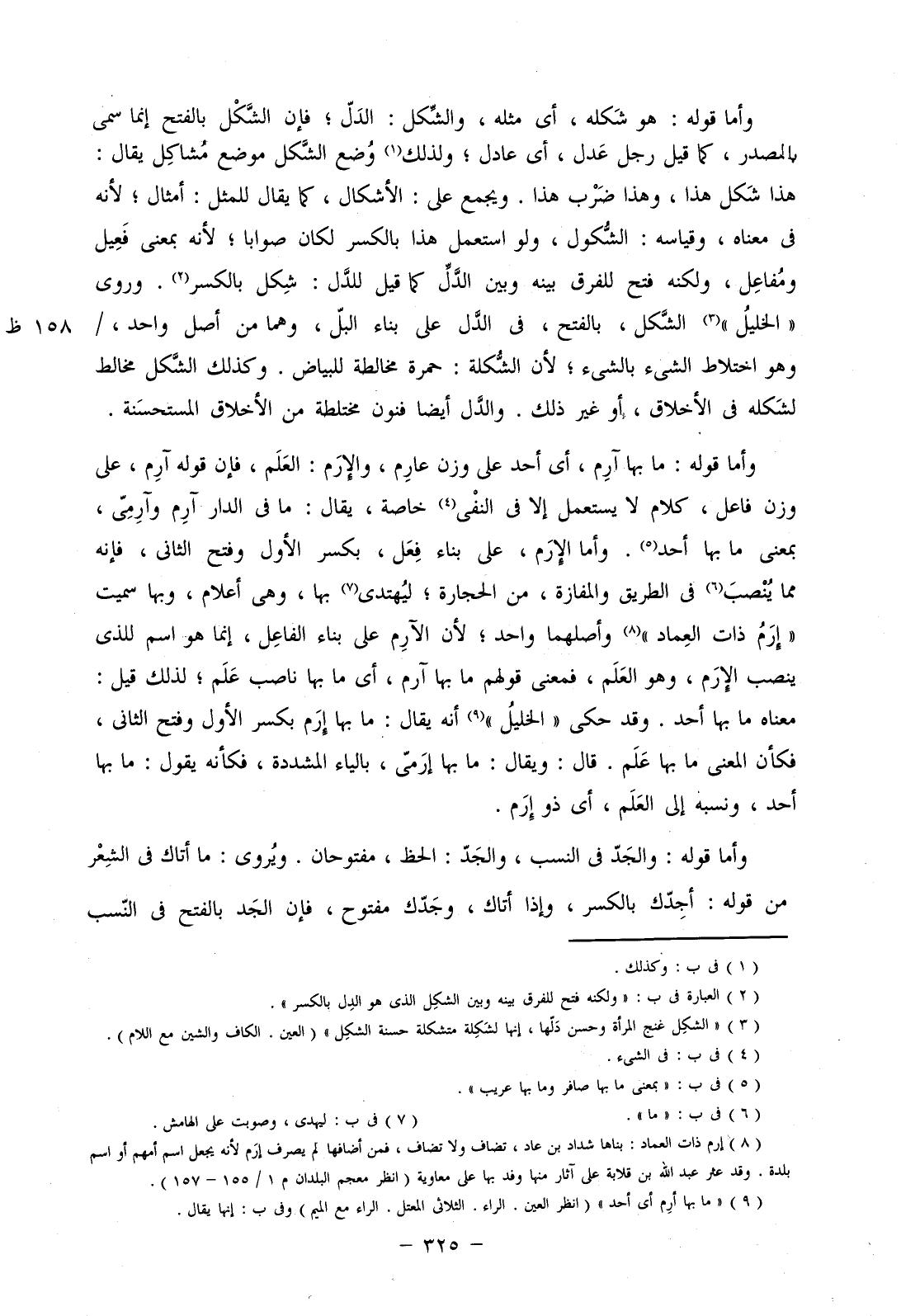 وأما قوله: هو شكله، أي مثله، والشكل: الدل؛ فإن الشكل بالفتح إنما سمي بالمصدر، كما قيل رجل عدل، أي عادل؛ ولذلك وضع الشكل موضع مشاكل يقال: هذا شكل هذا، وهذا ضرب هذا. ويجمع على: الأشكال، كما يقال للمثل: أمثال؛ لأنه في معناه، وقياسه: الشكول، ولو استعمل هذا بالكسر لكان صوابا؛ لأنه بمعنى فعيل ومفاعل، ولكنه فتح للفرق بينه وبين الدل كما قيل للدل: شكل بالكسر. وروى "الخليل" الشكل، بالفتح، في الدل على بناء البل، وهما من أصل واحد،/ وهو اختلاط الشيء بالشيء؛ لأن الشكلة: حمرة مخالطة للبياض. وكذلك الشكل مخالط لشكله في الأخلاق، أو غير ذلك. والدل أيضا فنون مختلطة من الأخلاق المستحسنة.