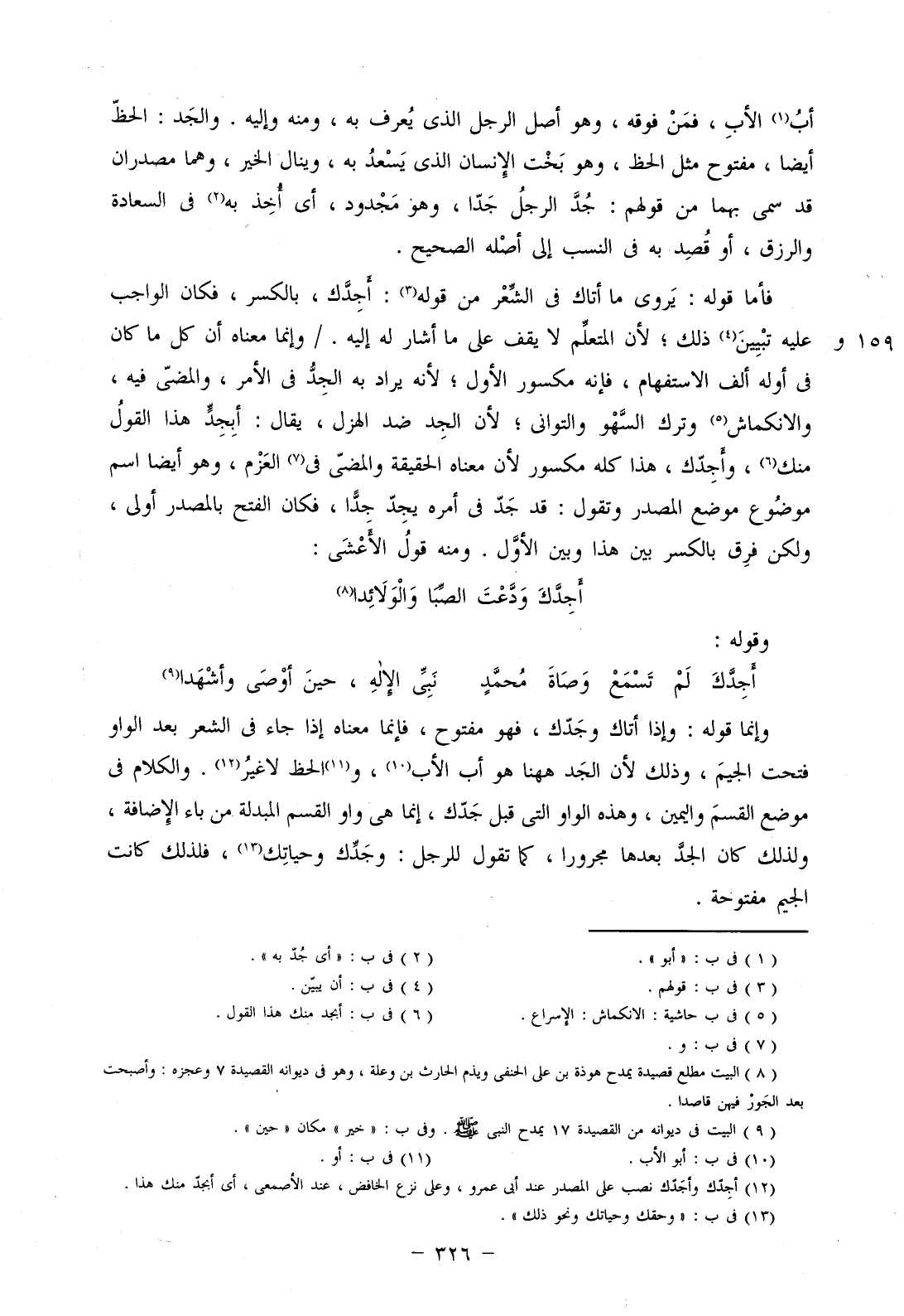وإنما قوله: وإذا أتاك وجدك، فهو مفتوح، فإنما معناه إذا جاء في الشعر بعد الواو فتحت الجيم، وذلك لأن الجد ههنا هو أب الأب، والحظ لا غير. والكلام في موضع القسم واليمين، وهذه الواو التي قبل جدك، إنما هي واو القسم المبدلة من باء الإضافة، ولذلك كان الجد بعدها مجرورا، كما تقول للرجل: وجدك وحياتك، فلذلك كانت الجيم مفتوحة.