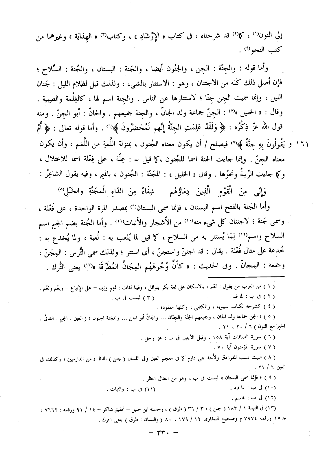 وأما قوله: والجنة: الجن، والجنون أيضا، والجنة: البستان، والجنة: السلاح؛ فإن أصل ذلك كله من الاجتنان، وهو الاستتار بالشيء، ولذلك قيل لظلام الليل: جنان الليل، وإنما سميت الجن جنا، لاستتارها عن الناس. والجنة اسم لها، كالغلمة والصبية. وقال: "الخليل": الجن جماعة ولد الجان، والجنة جميعهم. والجان: أبو الجن. ومنه قول الله عز ذكره: (ولَقَدْ عَلِمَتِ الجِنَّةُ إنَّهُمْ لَمُحْضَرُونَ). وأما قوله تعالى: (أَمْ يَقُولُونَ بِهِ جِنَّةٌ) فيصلح/ أن يكون معناه الجنون، بمنزلة اللمة من اللمم، وأن يكون معناه الجن. وإنما جاءت الجنة اسما للجنون، كما قيل به: علة، على فعلة اسما للاعتلال، وكما جاءت الريبة ونحوها. وقال "الخليل": المجنة: الجنون، بالميم، وفيه يقول الشاعر: