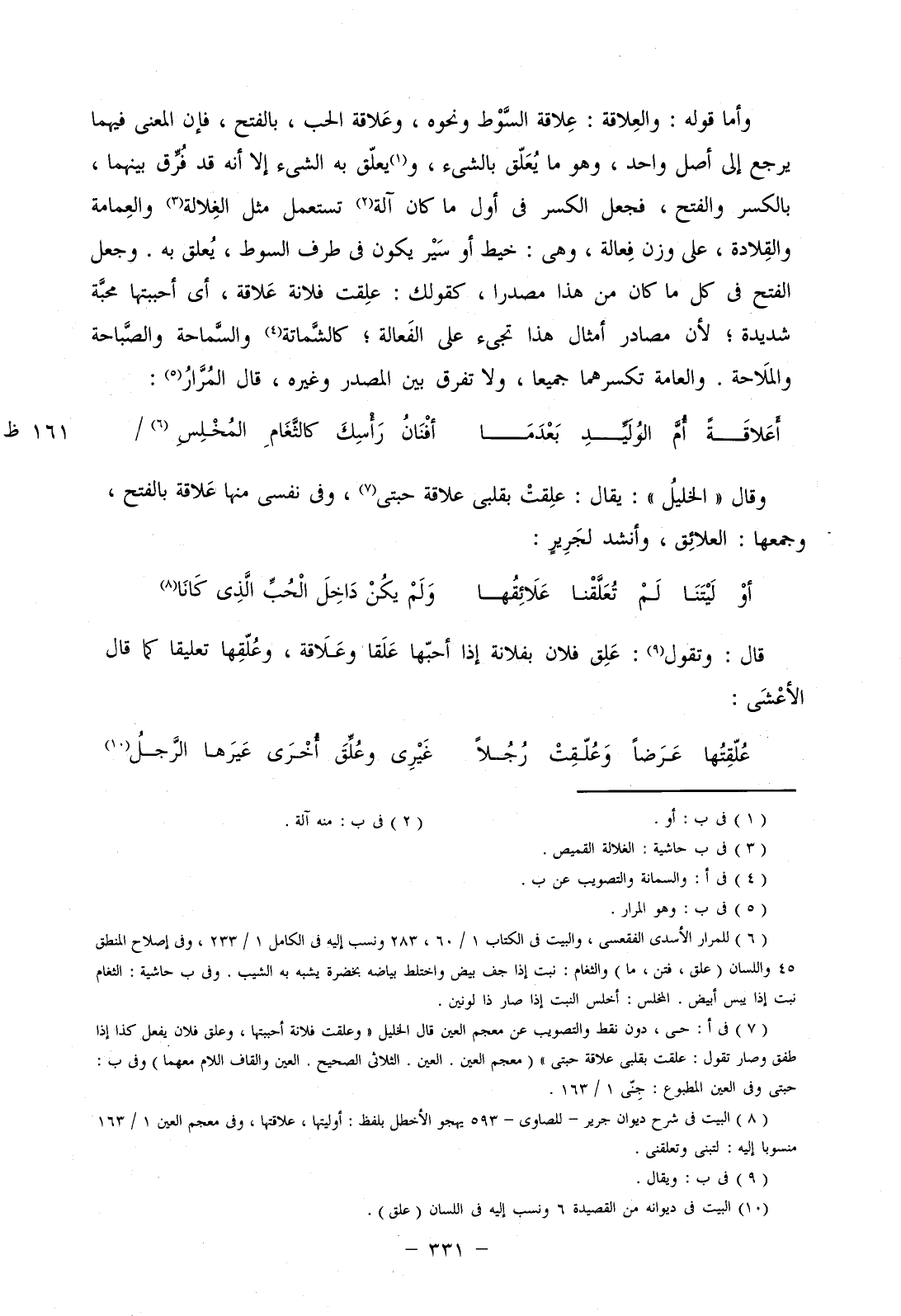 وقال "الخليل": يقال: علقت بقلبي علاقة حبتي، وفي نفسي منها علاقة بالفتح، وجمعها: العلائق، وأنشد لجرير: