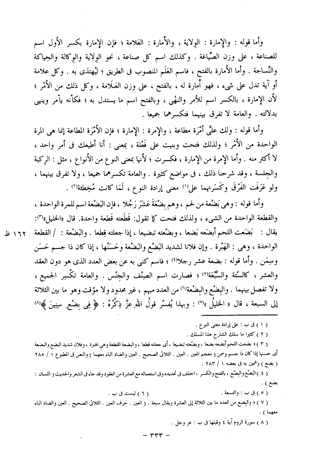 وأما قوله: والإمارة: الولاية، والأمارة: العلامة؛ فإن الإمارة بكسر الأول اسم للصناعة، على وزن الصياغة. وكذلك اسم كل صناعة، نحو الولاية والوكالة والحياكة والنساجة. وأما الإمارة بالفتح، فاسم العلم المنصوب في الطريق؛ ليهتدي به. وكل علامة أو آية تدل على شيء، فهو أمارة له، بالفتح، على وزن العلامة، وكل ذلك من الأمر؛ لأن الإمارة، بالكسر اسم للأمر والنهي، وبالفتح اسم ما يستدل به؛ فكأنه يأمر وينهى بدلالته. والعامة لا تفرق بينهما فتكسرهما جميعا.