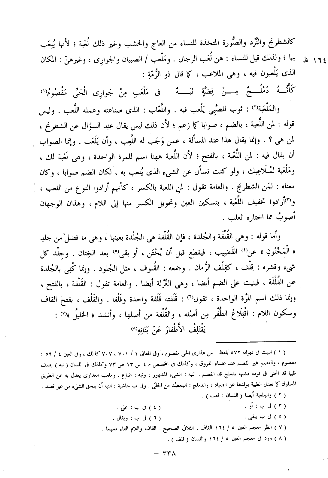 والملعبة: ثوب للصبي يلعب فيه. واللعاب: الذي صناعته وعمله اللعب. وليس قوله: لمن اللعبة، بالضم، صوابا كما زعم؛ لأن ذلك ليس يقال عند السؤال عن الشطرنج، لمن هي؟. وإنما يقال هذا عند المسألة، عمن وجب له اللعب، وأن يعلب. وإنما الصواب أن يقال فيه: لمن اللعبة، بالفتح؛ لأن اللعبة ههنا اسم للمرة الواحدة، وهي لعبة لك، وملعبة لملاعبك، ولو كنت تسأل عن الشيء الذي يعلب به، لكان الضم صوابا، وكان معناه: لمن الشطرنج. والعامة تقول: لمن اللعبة بالكسر، كأنهم أرادوا النوع من اللعب، وأرادوا تخفيف اللعبة، بتسكين العين وتحويل الكسر منها للى اللام، وهذان الوجهان أصوب مما اختاره ثعلب.
