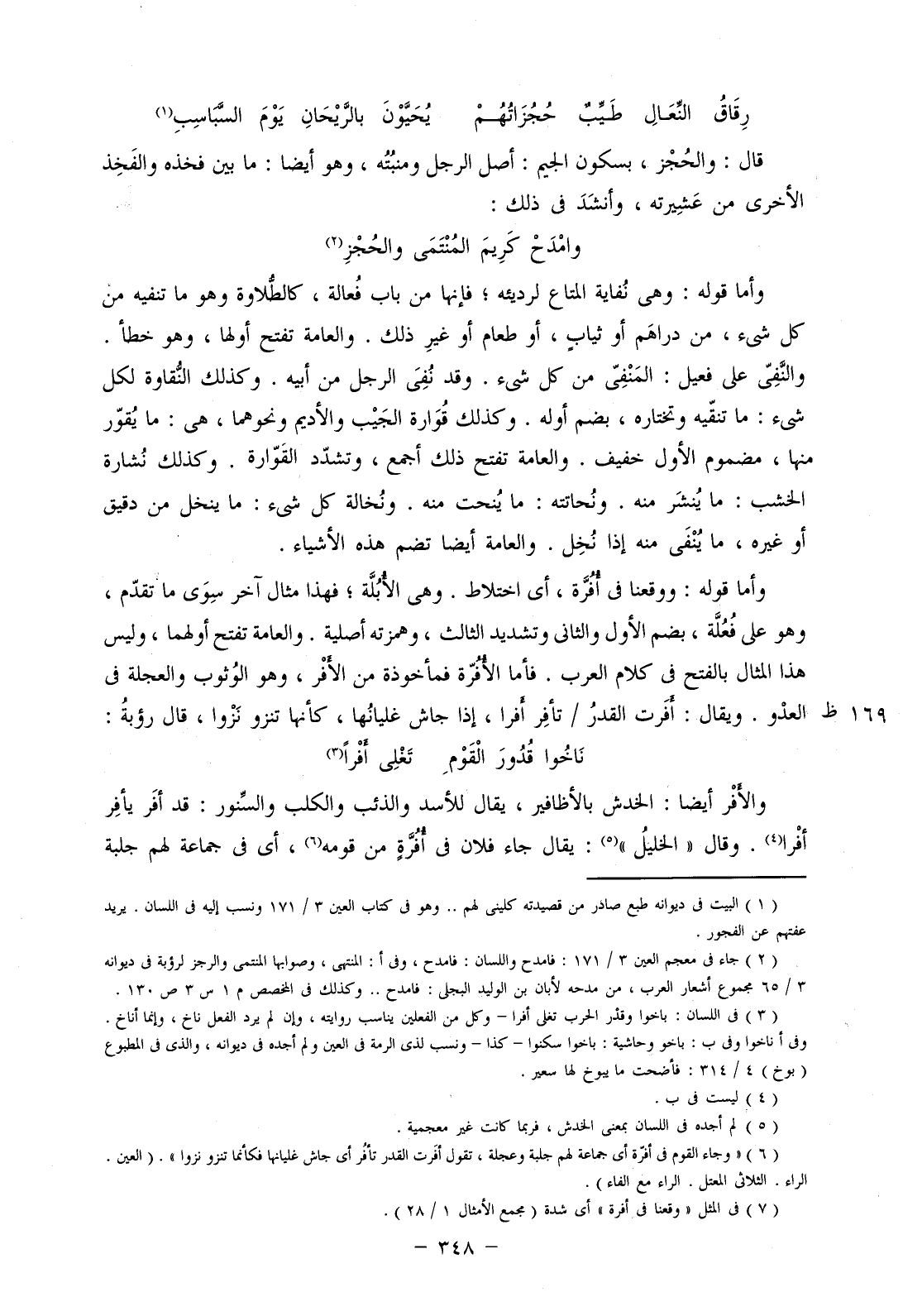 وأما قوله: ووقعنا في أفرة، أي اختلاط. وهي الأبلة؛ فهذا مثال آخر سوى ما تقدم، وهو على فعلة، بضم الأول والثاني وتشديد الثالث، وهمزته أصلية. والعامة تفتح أولهما، وليس هذا المثال بالفتح في كلام العرب. فأما الأفرة فمأخوذة من الأفر، وهو الوثوب والعجلة في العدو. ويقال: أفرت القدر/ تأفر أفرا، إذاجاش غليانها، كأنها تنزو نزوا، قال رؤبة: