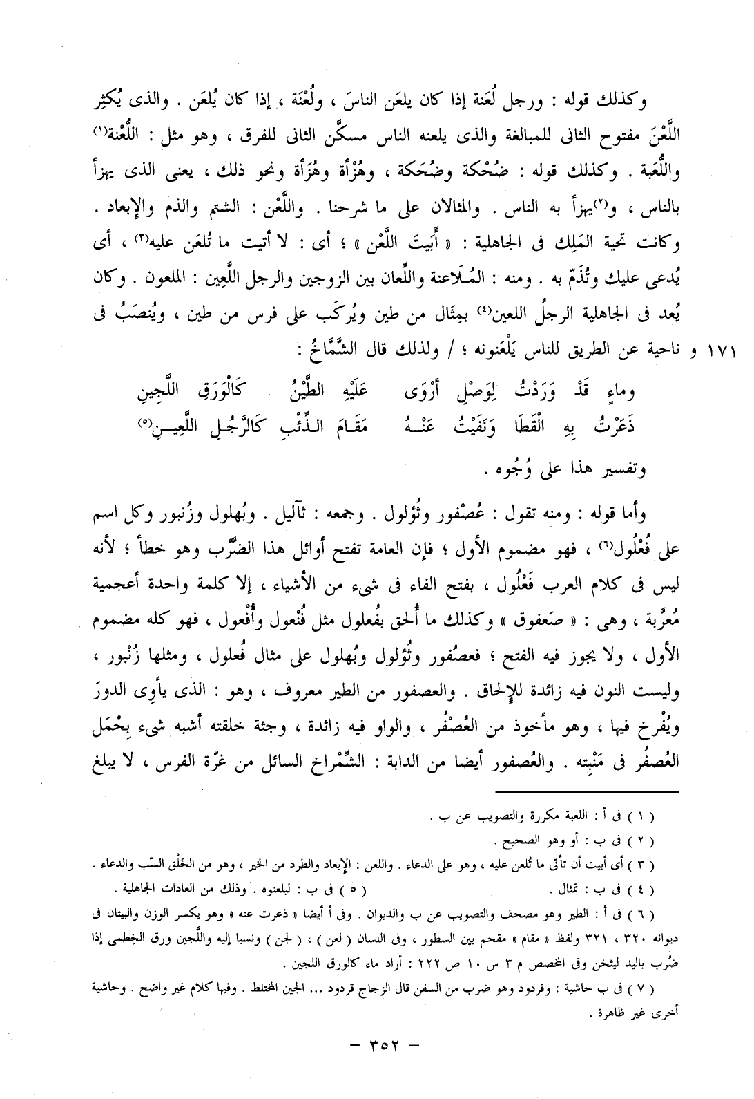 وكذلك قوله: ورجل لُعَنة إذا كان يلعن الناس، ولعنة، إذا كان يُلعن. والذي يكثر اللعن مفتوح الثاني للمبالغة والذي يلعن الناس مسكن الثاني للفرق، وهو مثل اللعنة واللعبة. وكذلك قوله: ضُحْكة وضُحَكة، وهزْأة وهزَأة ونحو ذلك، يعني الذي يهزأ بالناس، ويهزأ به الناس. والمثالان على ما شرحنا. واللعن: الشتم والذم والإبعاد. وكانت تحية الملك في الجاهلية: "أبيت اللعن" أي: لا أتيت ما تلعن عليه، أي يدعى عليك وتذم به. ومنه: الملاعنة واللعان بين الزوجين والرجل اللعين: الملعون. وكان يعد في الجاهلية الرجل اللعين بمثال من طين ويركب على فرس من طين، وينصب في ناحية عن الطريق للناس يلعنونه؛/ ولذلك قال الشماخ: