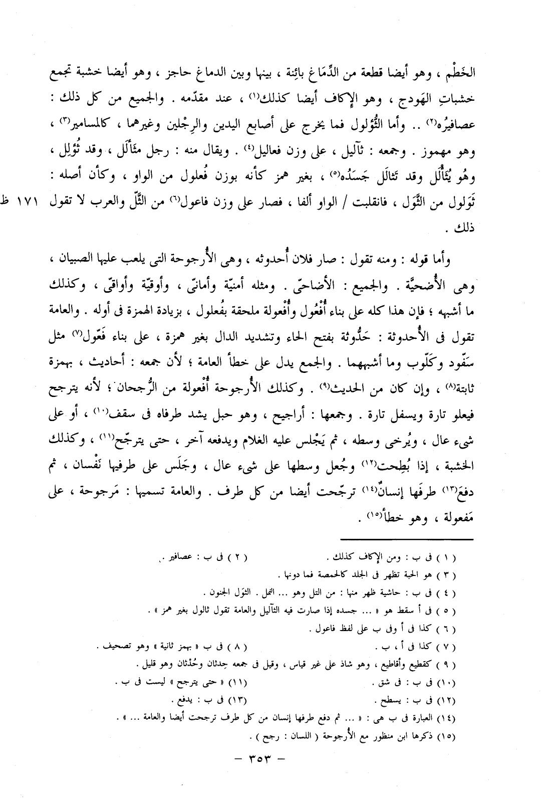 وأما قوله: ومنه تقول: صار فلان أحدوثه، وهي الأرجوحة التي يلعب عليها الصبيان، وهي الأضحية. والجميع: الأضاحي. ومثله أمنية وأماني، وأوقية وأواقي، وكذلك ما أشبهه؛ فإن هذا كله على بناء أفعول وأفعولة ملحقة بفعلول، بزيادة الهمزة في أوله. والعامة تقول في الأحدوثة: حدوثة بفتح الحاء وتشديد الدال بغيرر همزة، على بناء فعول مثل سفود وكلوب وما أشبههما. والجمع يدل على خطأ العامة؛ لأن جمعه: أحاديث، بهمزة ثابتة، وإن كان من الحديث. وكذلك الأرجوحة أفعولة من الرجحان؛ لأنه يترجح فيعلو تارة ويسفل تارة. وجمعها: أراجيح، وهو حبل يشد طرفاه في سقف، أو على شيء عال، ويرخى وسطه، ثم يجلس عليه الغلام ويدفعه آخر، حتى يترجح، وكذلك الخشبة، إذا بطحت وجعل وسطها على شيء عال، وجلس على طرفيها نفسان، ثم دفع طرفها إنسان ترجحت أيض من كل طرف. والعامة تسميها: مرجوحة، على مفعولة، وهو خطأ.
