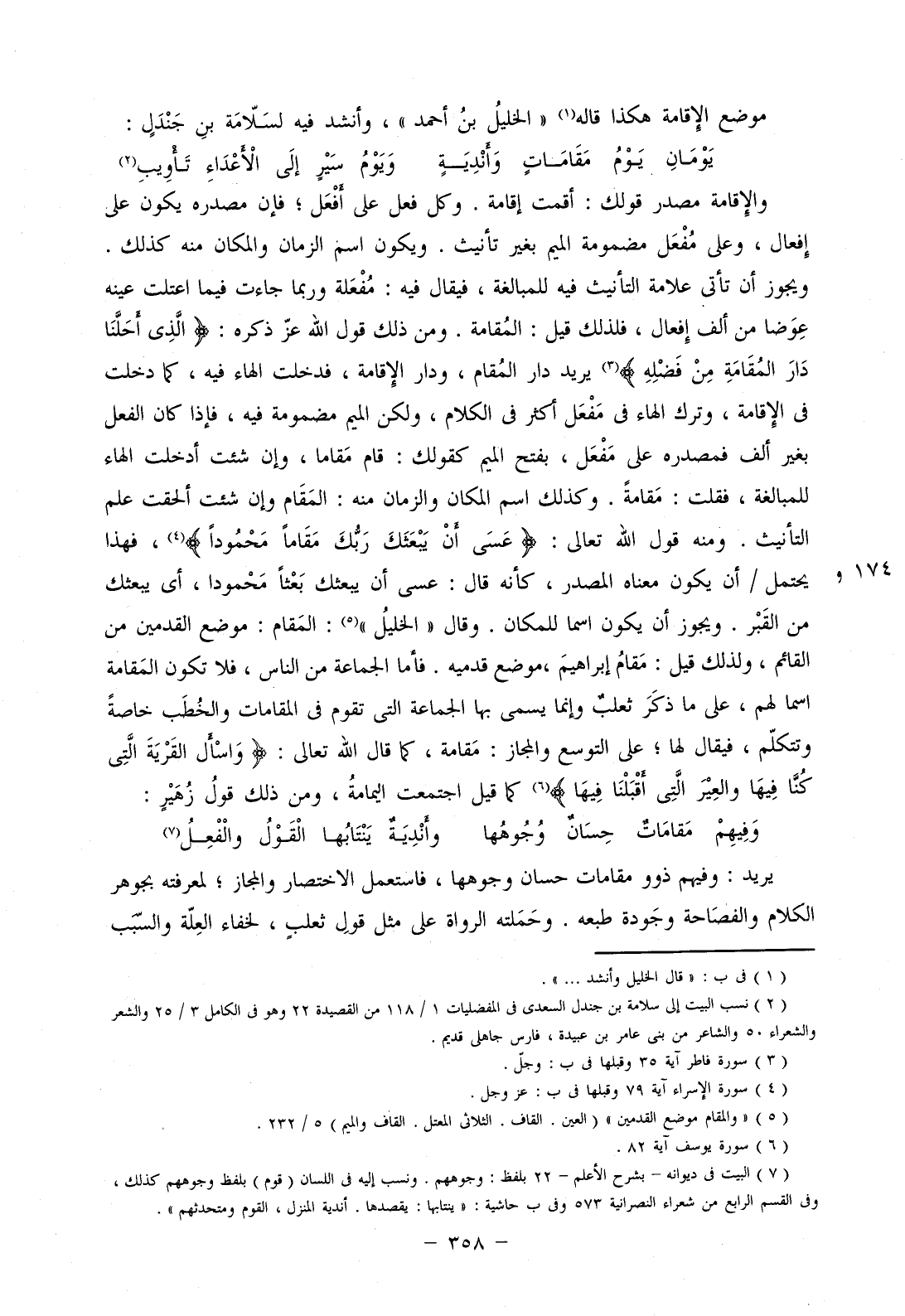 والإقامة مصدر قولك: أقمت إقامة. وكل فعل على أفعل؛ فإن مصدره يكون على إفعال، وعلى مفعل مضمومة الميم بغير تأنيث. ويكون اسم الزمان والمكان منه كذلك. ويجوز أن تأتي علامة التأنيث فيه للمبالغة، فيقال فيه: مفعلة وربما جاءت فيما اعتلت عينه عوضا عن ألف إفعال، فلذلك قيل: المقامة. ومن ذلك قول الله عز ذكره: (الَّذِي أَحَلَّنَا دَارَ المُقَامَةِ مِن فَضْلِهِ) يريد دار المقام، ودار الإقامة، فدخلت الهاء فيه، كما دخلت في الإقامة، وترك الهاء في مفعل أكثر في الكلام، ولكن الميم مضمومة فيه، فإذا كان الفعل بغير ألف فمصدره على مفعل، بفتح الميم كقولك: قام مقاما، وإن شئت أدخلت الهاء للمبالغة، فقلت: مقامة. وكذلك اسم المكان والزمان منه: المقام وإن شئت ألحقت علم التأنيث. ومنه قول الله تعالى: (عَسَى أَن يَبْعَثَكَ رَبُّكَ مَقَامًا مُّحْمُودًا)، فهذا يحتمل/ أن يكون معناه المصدر، كأنه قال: عسى أن يبعثك بعثا محمودا، أي يبعثك من القبر. ويجوز أن يكون اسما للمكان. وقال "الخليل": المقام: موضع القدمين من القائم، ولذلك قيل: مقام إبراهيم، موضع قدميه. فأما الجماعة من الناء، فلا تكون المقامة اسما لها، على ما ذكر ثعلب وإنما يسمى بها الجماعة التي تقوم في المقامات والخطب خاصة وتتكلم، فيقال لها؛ على التوسع والمجاز: مقامة، كما قال الله تعالى: (واسْأَلِ القَرْيَةَ الَّتِي كُنَّا فِيهَا والْعِيرَ الَّتِي أَقْبَلْنَا فِيهَا) كما قيل اجتمعت اليمامة، ومن ذلك قول زهير: