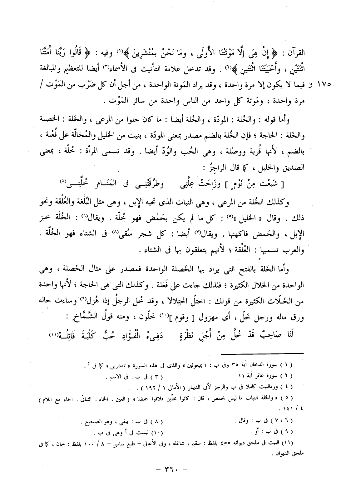 وأما قوله: والخلة: المودة، والخلة أيضا: ما كان حلوا من المرعى، والخلة: الخصلة والخلة: الحاجة؛ فإن الخلة بالضم مصدر بمعنى المودة، بنيت من الخليل والمخالة على فعلة، بالضم، لأنها قربة ووصلة، وهي الحب والود أيضا. وقد تسمى المرأة: خلة، بمعنى الصديق والخليل، كما قال الراجز: