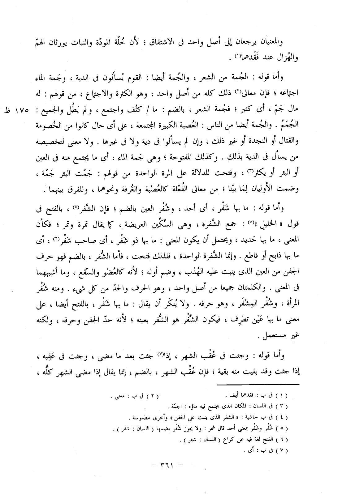 وأما قوله: الجمة من الشعر، والجمة أيض: القوم يسألون في الدية، وجمة الماء اجتماعه؛ فإن معاني ذلك كله من أصل واحد، وهو الكثرة والاجتماع، من قولهم: له مال جم، أي كثير؛ فجمة الشعر، بالضم: ما/ كثف واجتمع، ولم يطل والجميع: الجمم. والجمة أيضا من الناس: العصبة الكبيرة الجتمعة، على أي حال كانوا من الخصومة والقتال أو النجدة أو غير ذلك، وإن لم يسألوا في دية ولا في غيرها. ولا معنى لتخصيصه من يسأل في الدية بذلك. وكذلك المفتوحة؛ وهي جمة الماء، أي ما يجتمع منه في العين أو البئر أو يكثر، وفتحت للدلالة على المرة الواحدة من قولهم: جمت البئ جمة، وضمت الأوليان لما بينا؛ من معاني الفعلة كالعصبة والغرفة ونحوهما، وللفرق بينهما.