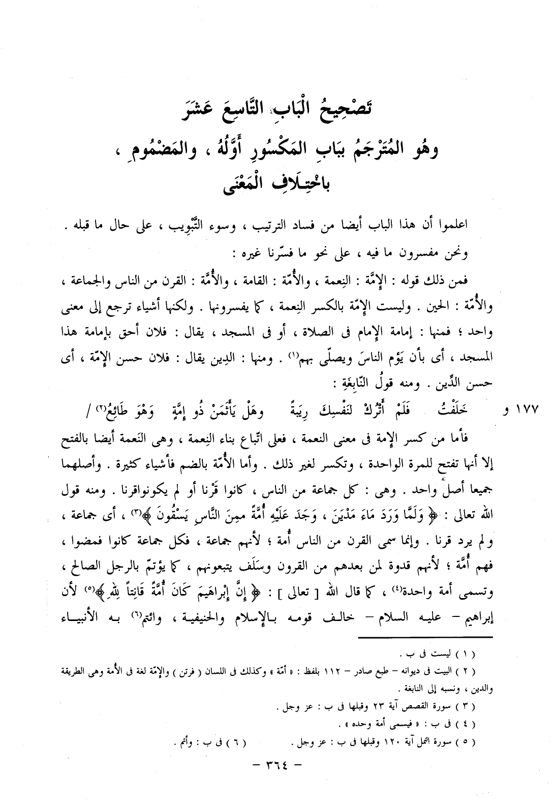 فمن ذلك قوله: الإمة: النعمة، والأمة: القامة، والأمة: القرن من الناس والجماعة، والأمة: الحين. وليست الإمة بالكسر النعمة، كما يفسرونها. ولكنها أشياء ترجع إلى معنى واحد؛ فمنها: إمامة الإمام في الصلاة، أو في المسجد، يقال: فلان أحق بإمامة هذا المسجد، أي بأن يؤم الناس ويصلي بهم. ومنها: الدين يقال: فلان حسن الإمة، أي حسن الدين. ومنه قول النابغة: