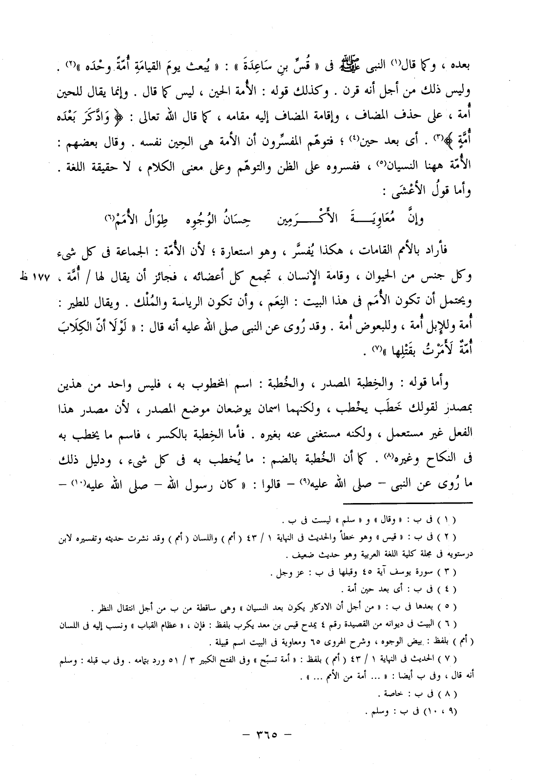 بعده، وكما قال النبي صلى الله عليه وسلم في "قس بن ساعدة": "يبعث يوم القيامة أمة وحده". وليس ذلك من أجل أنه قرن. وكذلك قوله: الأمة الحين، ليس كما قال. وإنما يقال للحين أمة، على حذف المضاف، وإقامة المضاف إليه مقامه، كما قال الله تعالى: (وادَّكَرَ بَعْدَ أُمَّةٍ). أي بعد حين؛ فتوهم المفسرون أن الأمة هي الحين نفسه. وقال بعضهم: الأمة ههنا النسيان، ففسروه على الظن والتوهم وعلى معنى الكلام، لا حقيقة اللغة. وأما قول الأعشى: