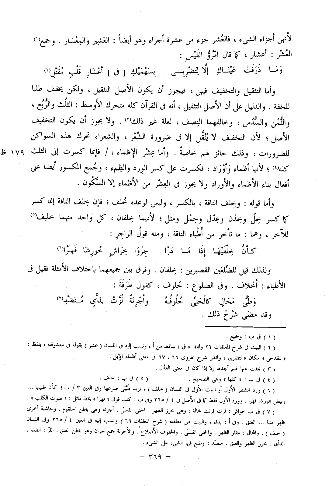 وأما التثقيل والتخفيف فيهن، فيجوز أن يكون الأصل التثقيل، ولكن يخفف طالبا للخفة. والدليل على أن الأصل التثقيل، أنه في القرآن كله متحرك الأوسط: الثلث والربع، والثمن والسدس، وخالفهما النصف، لعلة غير ذلك. ولا يجوز أن يكون التخفيف الأصل؛ لأن التخفيف لا يثقل إلا في ضرورة الشعر، والشعراء تحرك هذه السواكن للضرورات، وذلك جائز لهم خاصة. وأما عشر الإظماء، / فإنما كسرت إلى الثلث كله؛ لأنها أظماء وأوراد، فكسرت على كسر الورد والظمء، وجمع المكسور أيضا على أفعال بناء الأظماء والأوراد ولا يجوز في العشر من الأظماء إلا السكون.