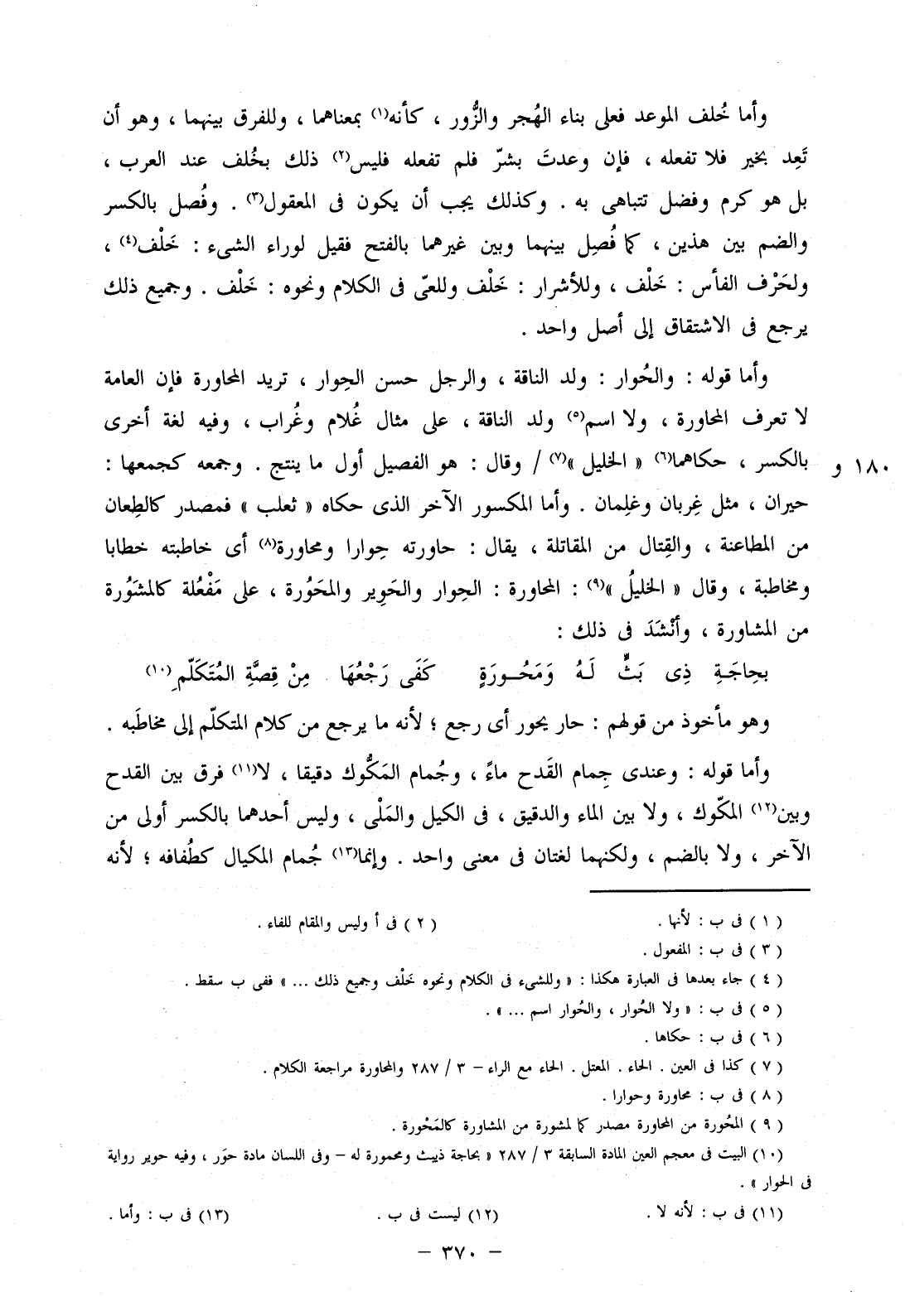 وأما قوله: والحوار: ولد الناقة، والرجل حسن الحوار، تريد المحاورة فإن العامة لا تعرف المحاورة، ولا اسم ولد الناقة، على مثال غلام وغراب، وفيه لغة أخرى بالكسر، حكاهما "الخليل"/ وقال: هو الفصيل أو ما ينتج. وجمعه كجمعها: حيران، مثل غربان وغلمان. وأما المكسور الآخر الذي حكاه "ثعلب" فمصدر كالطعان من المطاعنة، والقتال من المقاتلة، يقال: حاورته حوارا ومحاورة أي خاطبته خطابا وخطابة، وقال "الخليل": المحاورة: الحوار والحوير والمحورة، على مفعلة كالمشورة من المشاورة، وأنشد في ذلك: