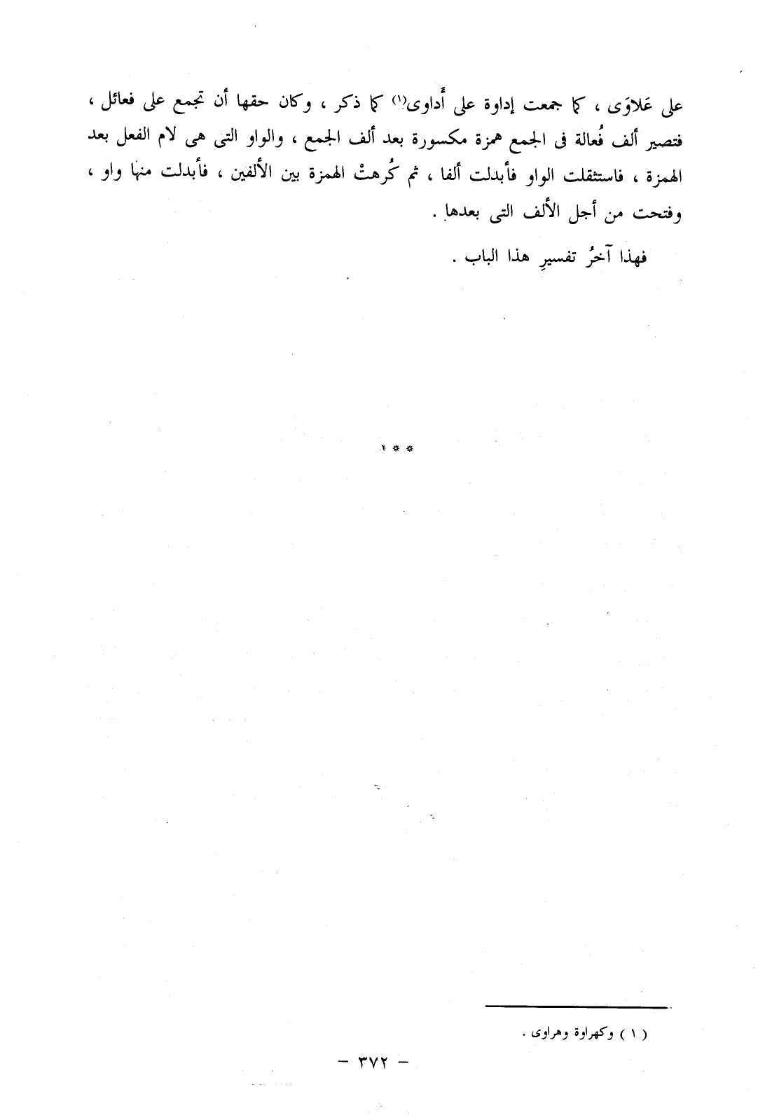 على علاوي، كما جمع إداوة على أدواي كما ذكر، وكان حقها أن تجمع على فعائل، فتصير ألف فعالة في الجمع همزة مكسورة بعد ألف الجمع، والواو التي هي لام الفعل بعد الهمزة، فاستثقلت الواو بأبدلت ألفا، ثم كرهت الهمزة بين الألفين، فأبدلت منها واو، وفتحت من أجل الألف التي بعدها.
