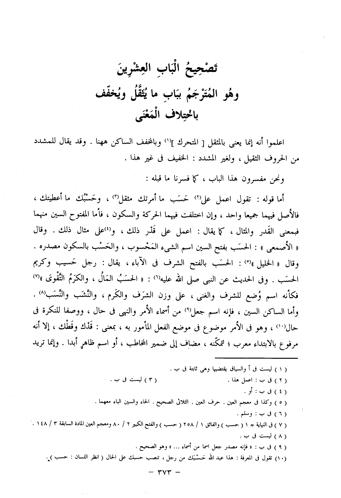 أما قوله: تقول اعمل على حسب ما أمرتك مثقل، وحسبك ما أعطيتك، فالأصل فيهما جميعا واحد، وإن اختلفت فيهما الحركة والسكون، فأما المفتوح السين منهما فبمعنى القدر والمثال، كما يقال: اعمل على قدر ذلك، وعلى مثال ذلك. وقال "الأصمعي": الحسب بفتح السين اسم الشيء المحسوب، والحسب بالسكون مصدره. وقال "الخليل": الحسب بالفتح الشرف في الآباء، يقال: رجل حسيب وكريم الحسب. وفي الحديث عن النبي صلى الله عليه: "الحسب المال، والكرم التقوى" فكأنه اسم وضع للشرف والغنى، على وزن الشرف والكرم، والنشب والنسب. وأما الساكن السين، فإنه اسم جعل من أسماء الأمر والنهي في حال، ووصفا للنكرة في حال، وهو في الأمر موضوع في موضع الفعل المأمور به، بمعنى: قدك وقطك، إلا أنه مرفوع بالابتداء معرب؛ لتمكنه، مضاف إلى ضمير المخاطب، أو اسم ظاهر أبدا. وإنما تريد