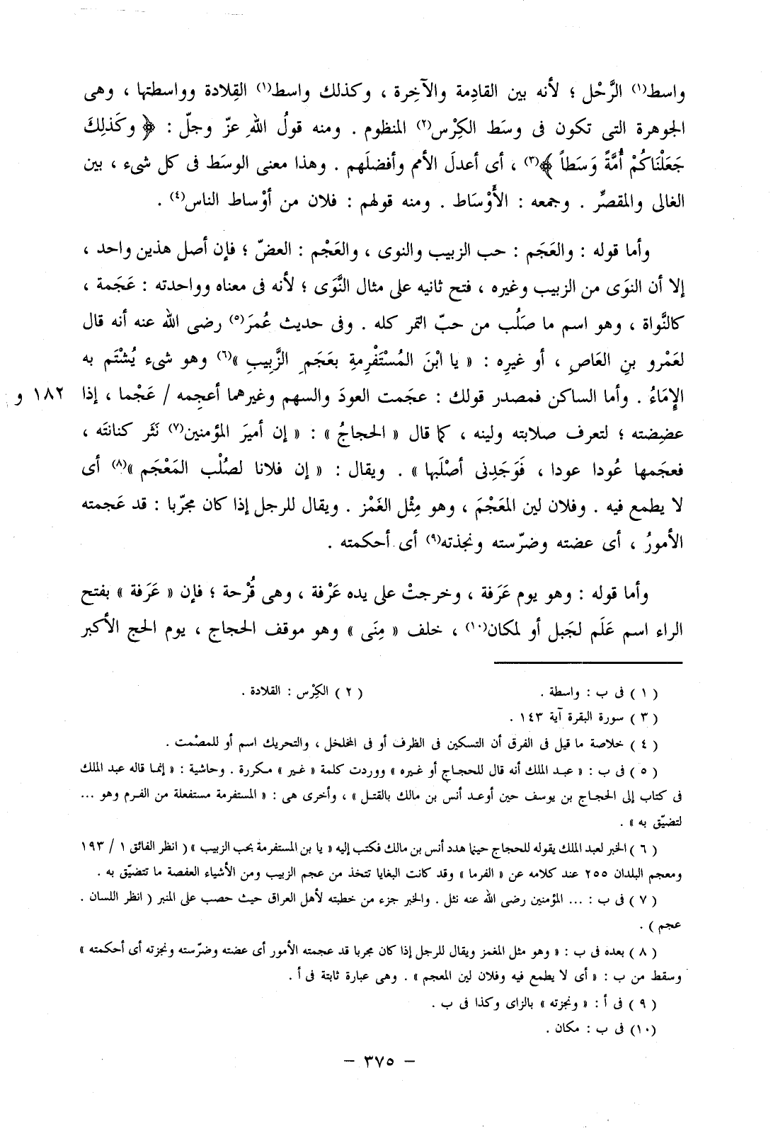 وأما قوله: والعجم: حب الزبيب والنوى، والعجم: العض؛ فإن أصل هذين واحد، إلا أن النوى من الزبيب وغيره، فتح ثانيه على مثال النوى؛ لأنه في معناه وواحدته: عجمة، كالنواة، وهو اسم ما صلب من حب التمر كله. وفي حديث عمر رضي الله عنه أنه قال لعمرو بن العاص، أو غيره: "يا ابن المستفرمة بعجم الزبيب" وهو شيء يشتم به الإماء. وأما الساكن فمصدر قولك: عجمت العود والسهم وغيرهما أعجمه/عجما، إذا عضضته؛ لتعرف صلابته ولينه، كما قال "الحجاج": "إن أمير المؤمنين نثر كنانته، فجعمها عودا عودا، فوجدني أصلبها". ويقال: "إن فلانا لصلب المعجم" أي لا يطمع فيه. وفلان لين المعجم، وهو مثل الغمز. ويقال للرجل إذا كان مجربا: قد عجمته الأمور، أي عضته وضرسته ونجذته أي أحكمته.