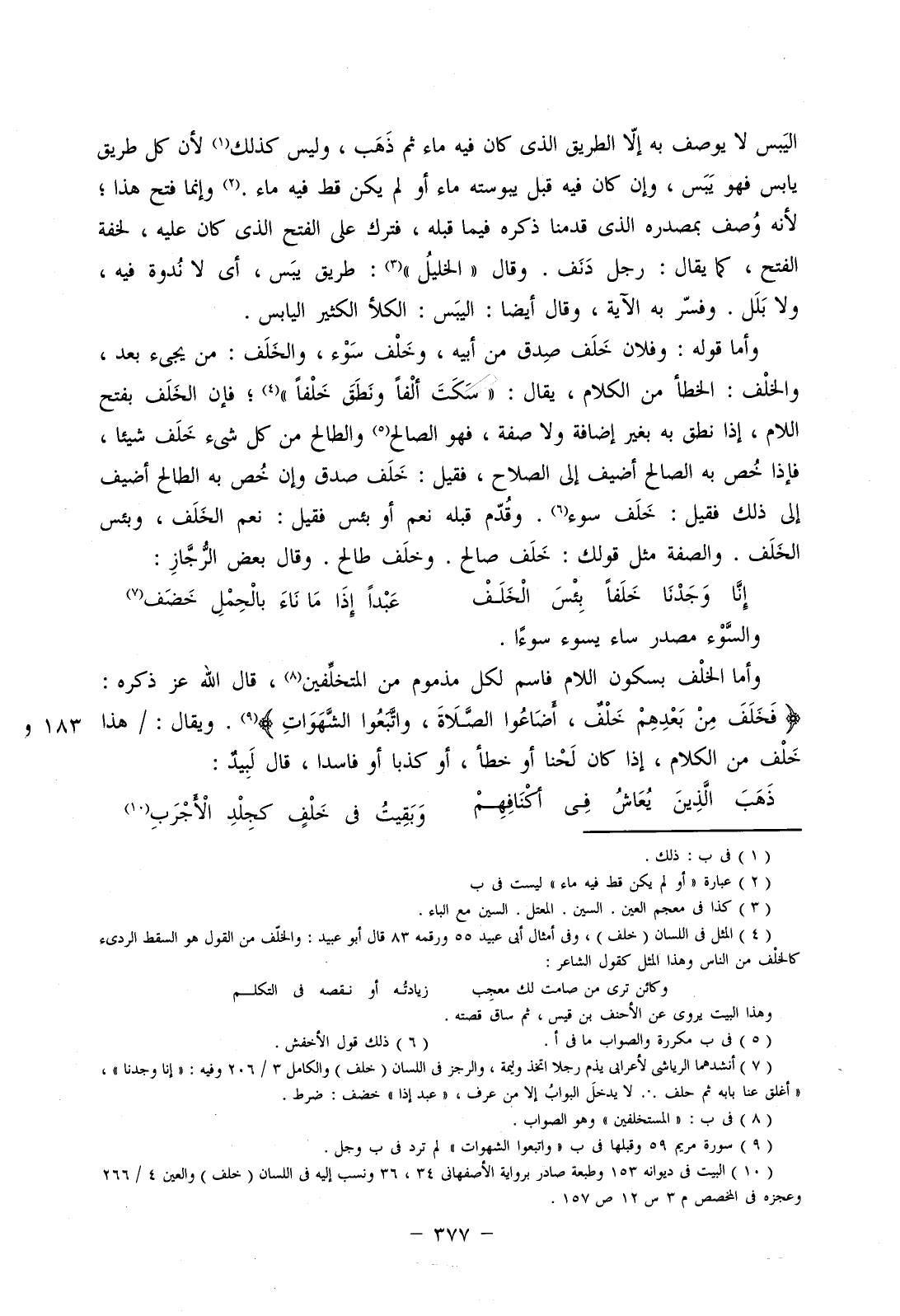 وأما الخلف بسكون اللام فاسم لكل مذموم من المتخلفين، قال الله عز ذكره: (فَخَلَفَ مِنْ بَعْدِهِمْ خَلْفٌ أَضَاعُوا الصَّلاةَ واتَّبَعُوا الشَّهَوَاتِ). ويقال:/ هذا خلف من الكلام، إذا كان لحنا أوخطأ، أو كذبا أو فاسدا، قال لبيد: