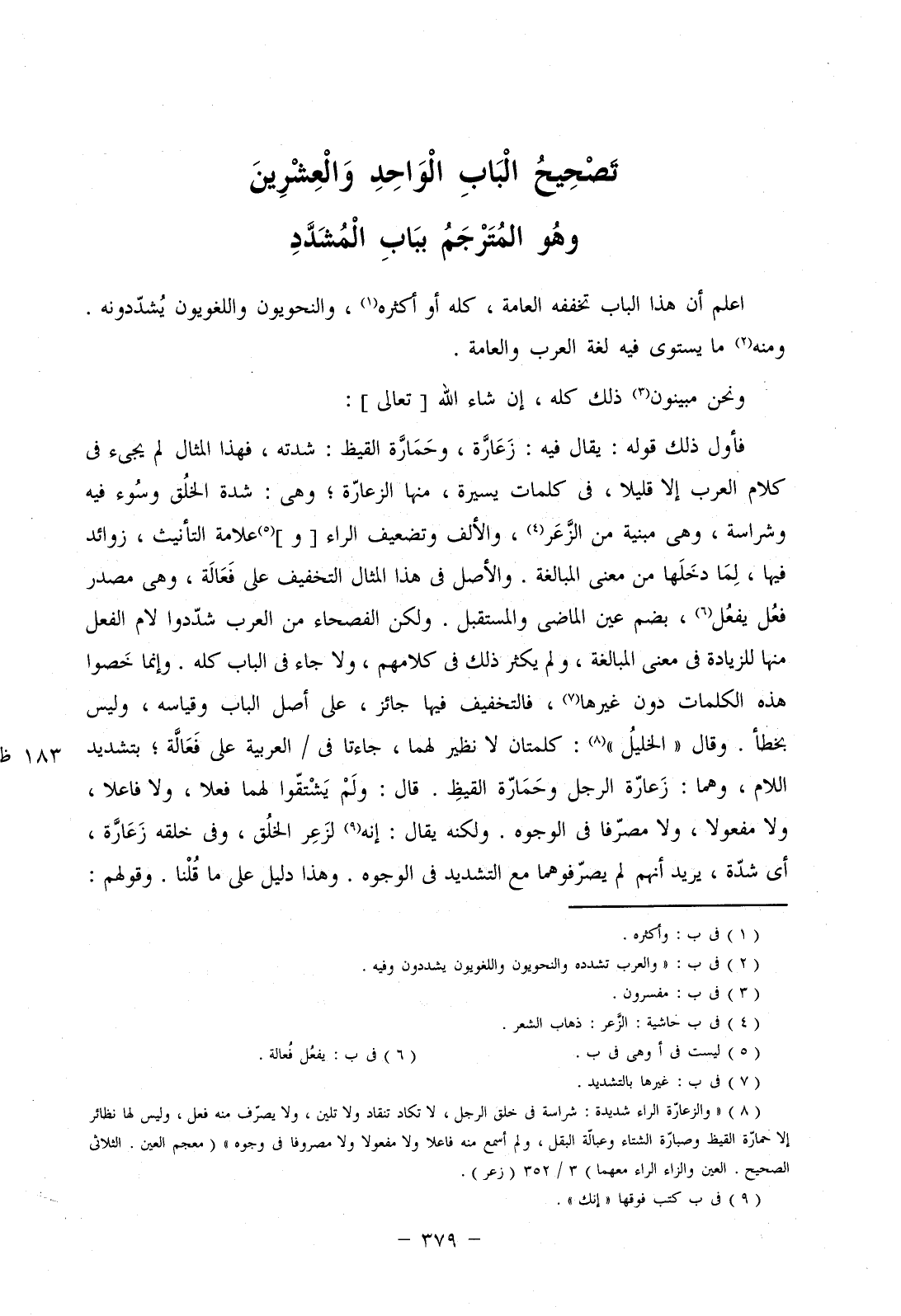 اعلم أن هذا الباب تخففه العامة، كله أو أكثره، والنحويون واللغويون يشددونه. ومنه ما يستوي فيه لغة العرب والعامة.