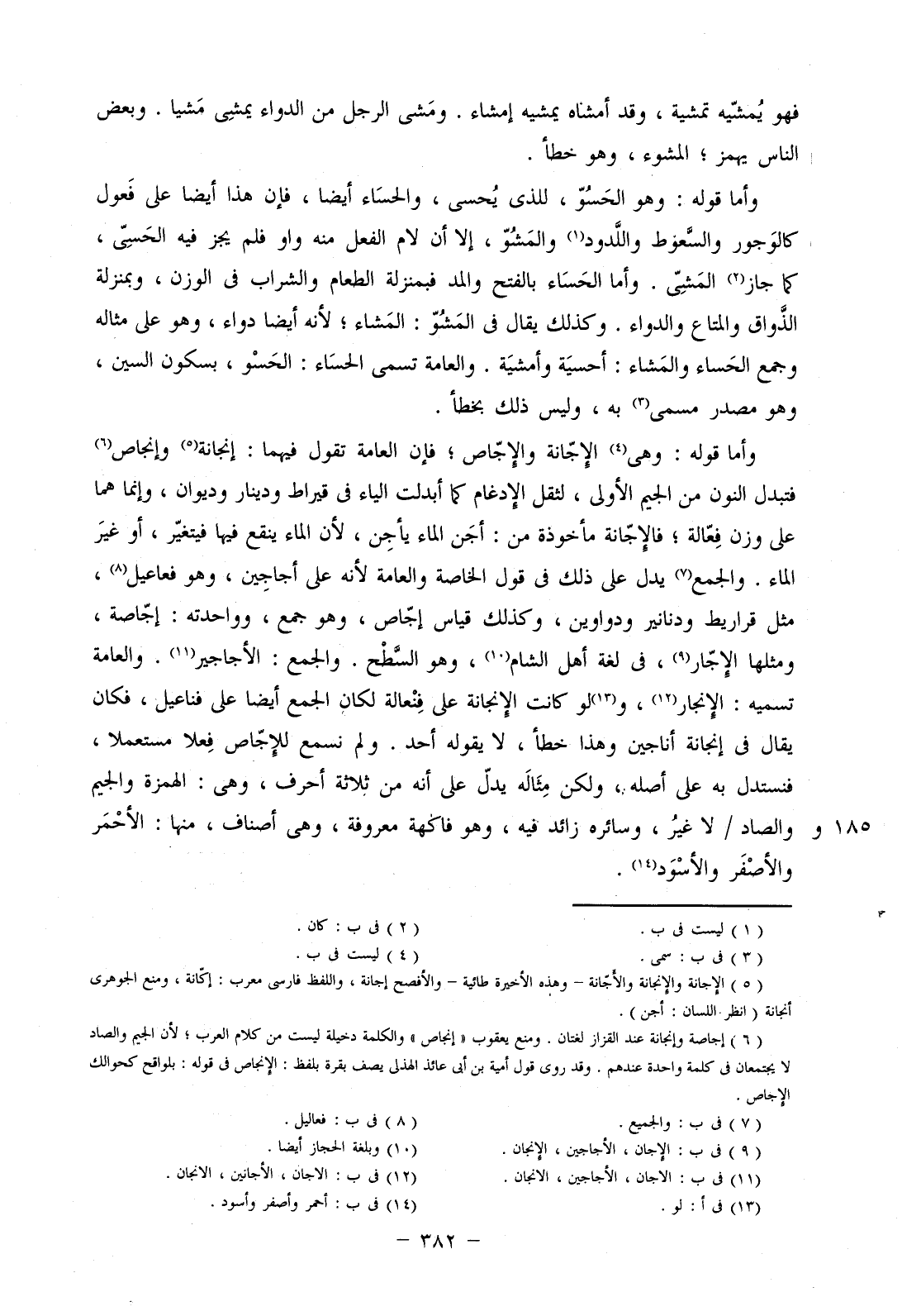 وأما قوله: وهي الإجانة والإجاص؛ فإن العامة تقول فيهما: إنجانة وإنجاس فتبدل النون من الجيم الأولى، لثقل الإدغام كما أبدلت الياء في قيراط ودينار وديوان، وإنما هما على وزن فعالة؛ فالإجانة مأخوذة من: أجن الماء يأجن، لأن الماء ينقع فيها فيتغير، أو غير الماء. والجمع يدل على ذلك في قول الخاصة والعامة لأنه على أجاجين، وهو فعاعيل، مثل قراريط ودنانير ودواوين، وكذلك قياس إجاص، وهو جمع، وواحدته: إجاصة، ومثلها الإجار، في لغة أهل الشام، وهو السطح. والجمع: الأجاجير. والعامة تسميه: الإنجار، ولو كانت الإنجانة على فنعالة لكان الجمع أيضا على فناعيل، فكان يقال في إنجانة أناجين وهذا خطأ، لا يقوله أحد. ولم نسمع للإجاص فعلا مستعملا، فنستدل به على أصله، ولكن مثاله يدل على أنه من ثلاثة أحرف، وهي: الهمزة والجيم والصاد/ لا غير، وسائره زائد فيه، وهو فاكهة معروفة، وهي أصناف، منها: الأحمر والأصفر والأسود.