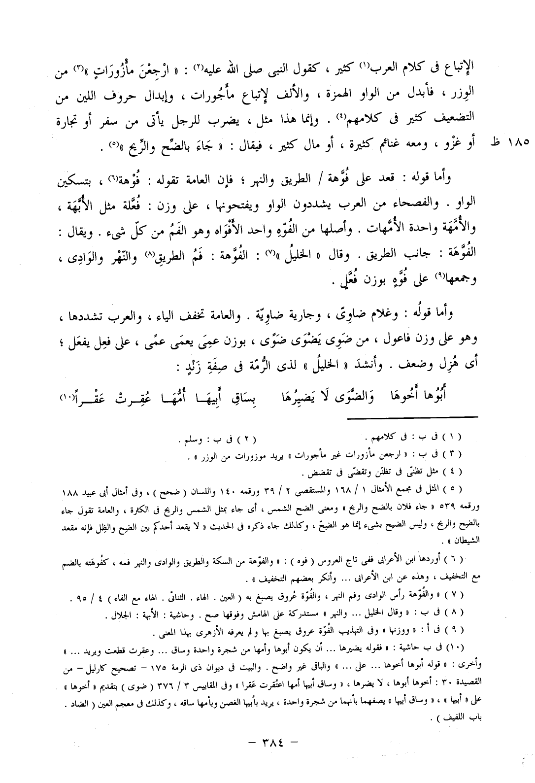 وأما قوله: قعد على فوهة/ الطريق والنهر؛ فإن العامة تقوله: فوهة، بتسكين الواو. والفصحاء من العرب يشددون الواو ويفتحونها، على وزن: فعلة مثل الأبهة، والأمهة واحدة الأمهات. وأصلها من الفوه واحد الأفواه وهو الفم من كل شيء. ويقال: الفوهة: جانب الطريق. وقال "الخليل": الفوهة: فم الطريق والنهر والوادي، وجمعها على فوه بوزن فعل.