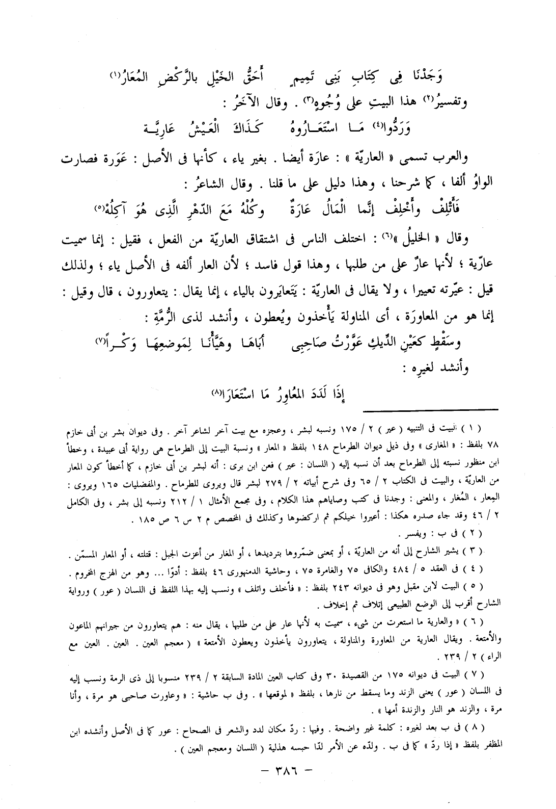 والعرب تسمى "العارية": عارة أيضا. بغير ياء، كأنها في الأصل: عورة فصارت الواو ألفا، كما شرحنا، وهذا دليل على ما قلنا. وقال الشاعر:
