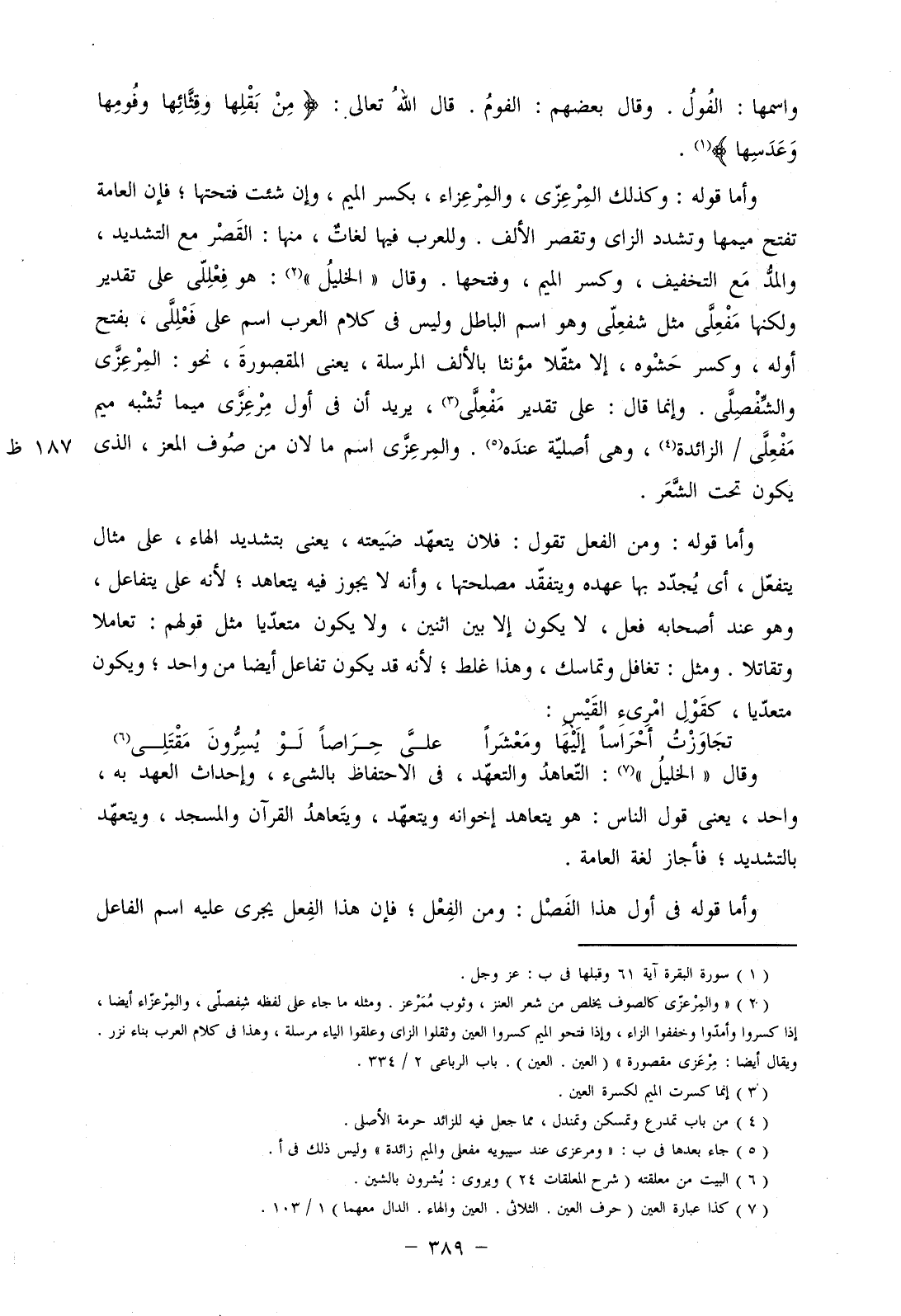 وأما قوله: وكذلك المرعزي، والمرعزاء، بكسر الميم، وإن شئت فتحتها؛ فإن العامة تقتح ميمها وتشدد الزاي وتقصر الألف. وللعرب فيها لغات، منها: القصر مع التشديد، والمد مع التخفيف، وكسر الميم، وفتحها. وقال "الخليل": هو فعللي على تقدير ولكنها مفعلي مثل شفعلي وهو اسم الباطل وليس في كلام العرب اسم على فعللي، بفتح أوله، وكسر حشوه، إلا مثقلا مؤنثا بالألف المرسلة، يعني المقصورة، نحو: المرعزي والشفصلى. وإنما قال: على تقدير مفعلى، يريد أن في أول مرعزي ميما تشبه ميم مفعلى/ الزائدة، وهي أصيلة عنده. والمرعزى اسم ما لان من صوف المعز، الذي يكون تحت الشعر.