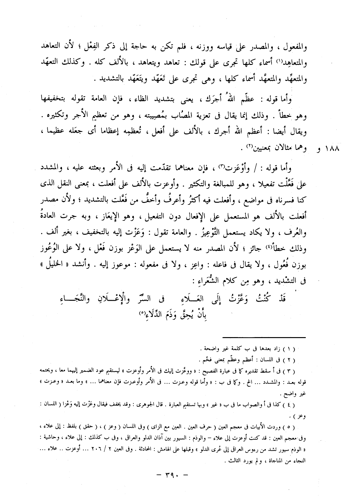 وأما قوله: عظم الله أجرك، يعني بتشديد الظاء، فإن العامة تقوله بتخفيفها وهو خطأ. وذلك إنما يقال في تعزية المصاب بمصيبته، وهو من تعظيم الأجر وتكثيره. ويقال أيضا: أعظم الله أجرك، بالألف على أفعل، تعظمه إعظاما أي جعله عظيما، وهما مثالان بمعنيين.