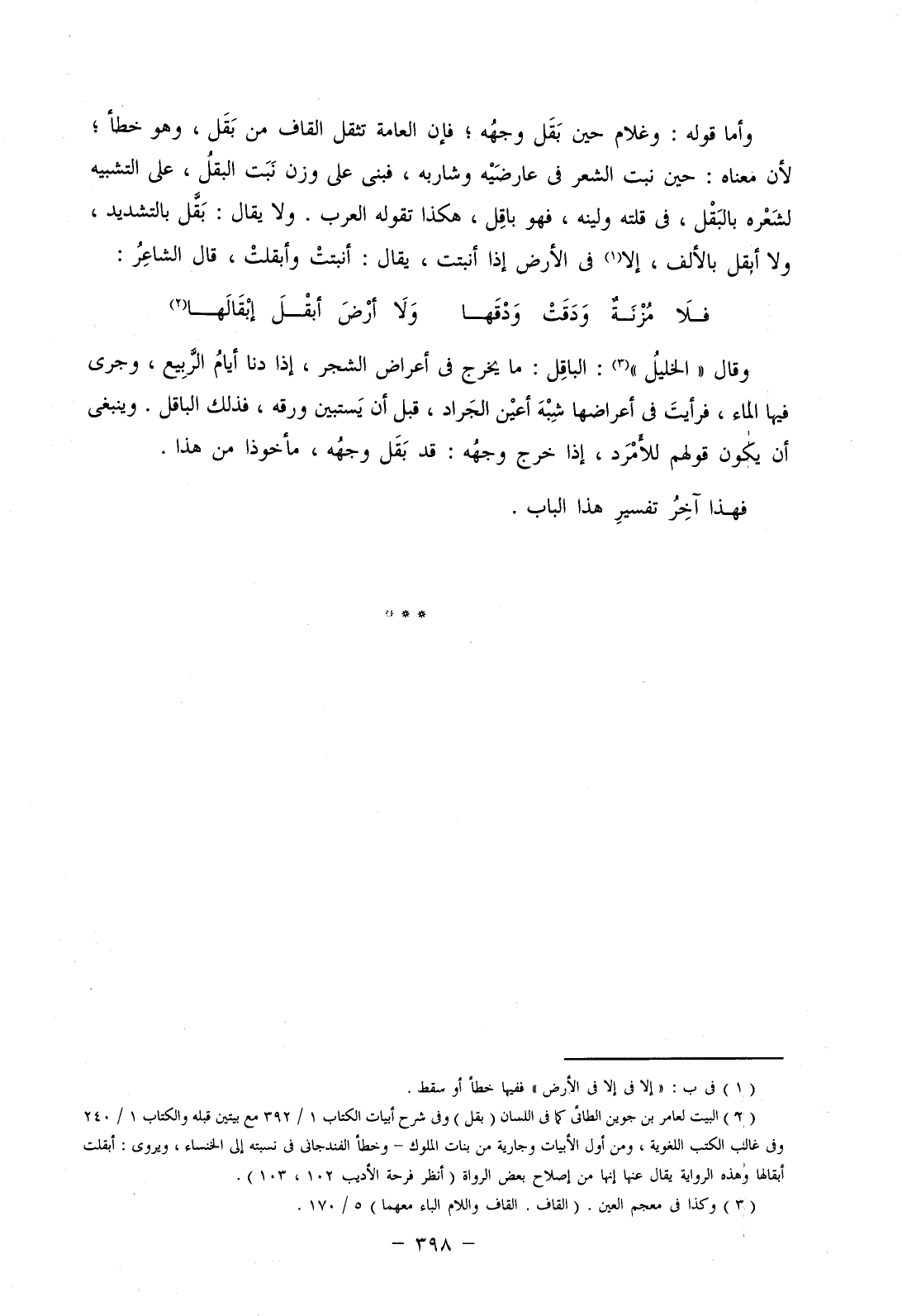 وأما قوله: وغمرت حين بقل وجهه؛ فإن العامة تثقل القاف من بقل، وهو خطأ؛ لأن معناه: حين نبت الشعر في عارضيه وشاربه، فبنى على وزن نبت البقل، على التشبيه لشعره بالبقل، في قلته ولينه، فهو باقل، هكذا تقوله االعرب. ولا يقال: بقل بالتشديد، ولا أبقل بالألف، إلا في الأرض إذا أنبتت، يقال: أنبتت وأبقلت، قال الشاعر:
