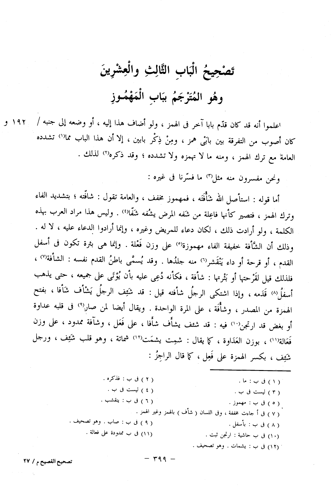 اعلموا أنه قد كان قدم بابا آخر في الهمز، ولو أضاف هذا إليه، أو وضعه إلى جنبه/ كان أصوب من التفرقة بين بابي همز، ومن ذكر بابين، إلا أن هذا الباب مما تشدده العامة مع ترك الهمز، ومنه ما لا تهمزه ولا تشدده؛ وقد ذكره لذلك.