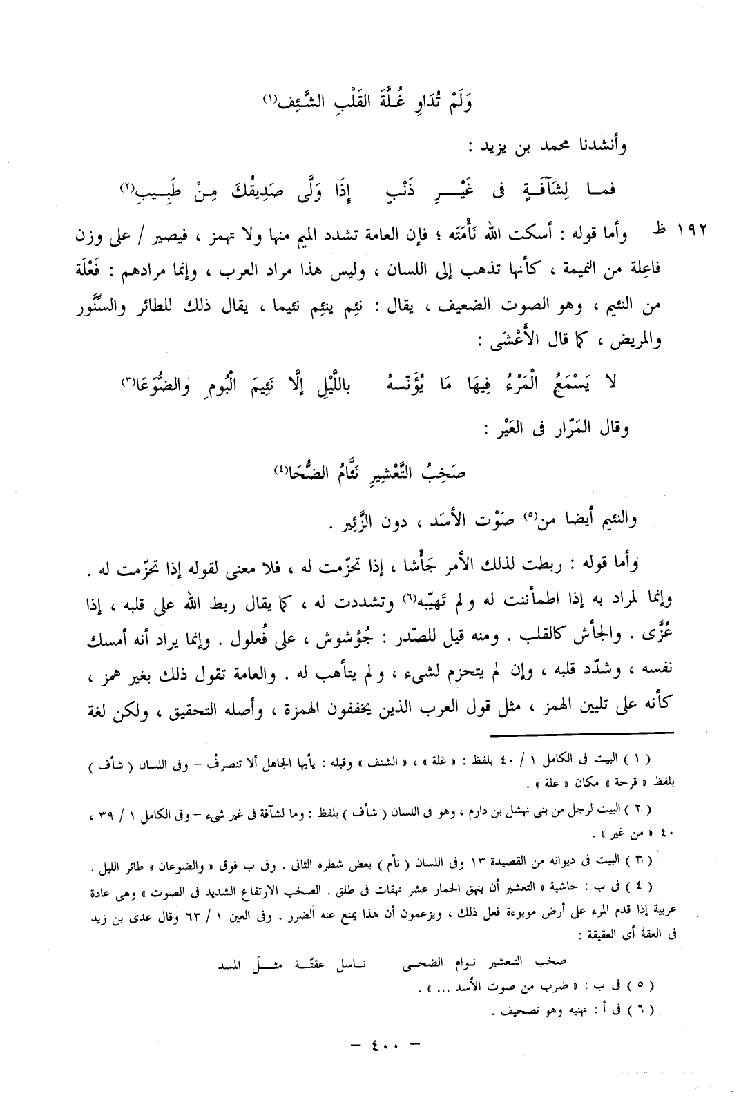 وأما قوله: أسكت الله نأمته؛ فإن العامة تشدد الميم منها ولا تهمز، فيصير / على وزن فاعلة من النميمة، كأنها تذهب إلى اللسان، وليس هذا مراد العرب، وإنما مرادهم: فعلة من النئيم، وهو الصوت الضعيف، يقال: نئم ينئم نئيما، يقال ذلك للطائر والسنور والمريض، كما قال الأعشى: