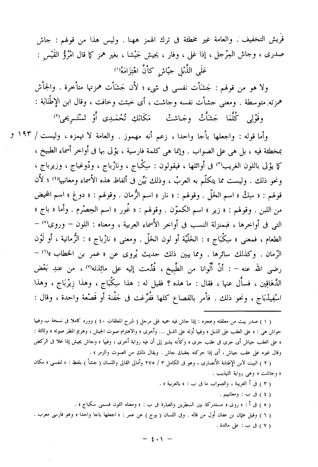 وأما قوله: واجعلها بأجا واحدا، زعم أنه مهموز. والعامة لا تهمزه، وليس/ بمخطئة فيه، بل هي على الصواب. وإنما هي كلمة فارسية، يؤتى بها في أواخر أسماء الطبيخ، كما يؤتى باللون الغريب في أوائلها، فيقولون: سكباج، ونارباج، ودوغباج، وزيرباج، ونحو ذلك. وليست مما يتكلم به العرب، وذلك بين في ألفاظ هذه الأسماء ومعانيها؛ لأن قولهم: "سك" اسم الخل. وقولهم: "نار" اسم الرمان. وقولهم: "دوغ" اسم المخيض من اللبن. وقولهم: "زير" اسم الكمون. وقولهم: "غور" اسم الحصرم. وأما "باج" التي في أواخرها، فبمنزلة النسب في أواخر الأسماء العربية، ومعناه: اللون- وروي- الطعام، فمعنى "سكباج": الخلية أو لون الخل. ومعنى "نارباج": الرمانية، أو لون الرمان. وكذلك سائرها. ومما يبين ذلك حديث يروى عن "عمر بن الخطاب"- رضي الله عنه-: أنا ألوانا من الطبيخ، قدمت إليه على مائدته، من عند بعض الدهاقين، فسأل عنها، فقال: ما هذه؟ فقيل له: هذا سكباج، وهذا زيرباج، وهذا اسفيدباج، ونحو ذلك. فأمر بالقصاع كلها ففرغت في جفنة أو قصعة واحدة، وقال:
