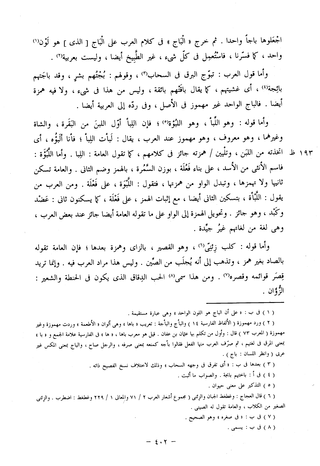 وأما قول العرب: تبوج البرق في السحاب، وقولهم: بجتهم بشر، وقد باجتهم بائجة، أي غشيتهم، كما يقال باقتهم بائقة، وليس من هذا في شيء، ولا فيه همزة أيضا. فالباج الواحد غير مهموز في الأصل، وفي رده إلى العربية أيضا.