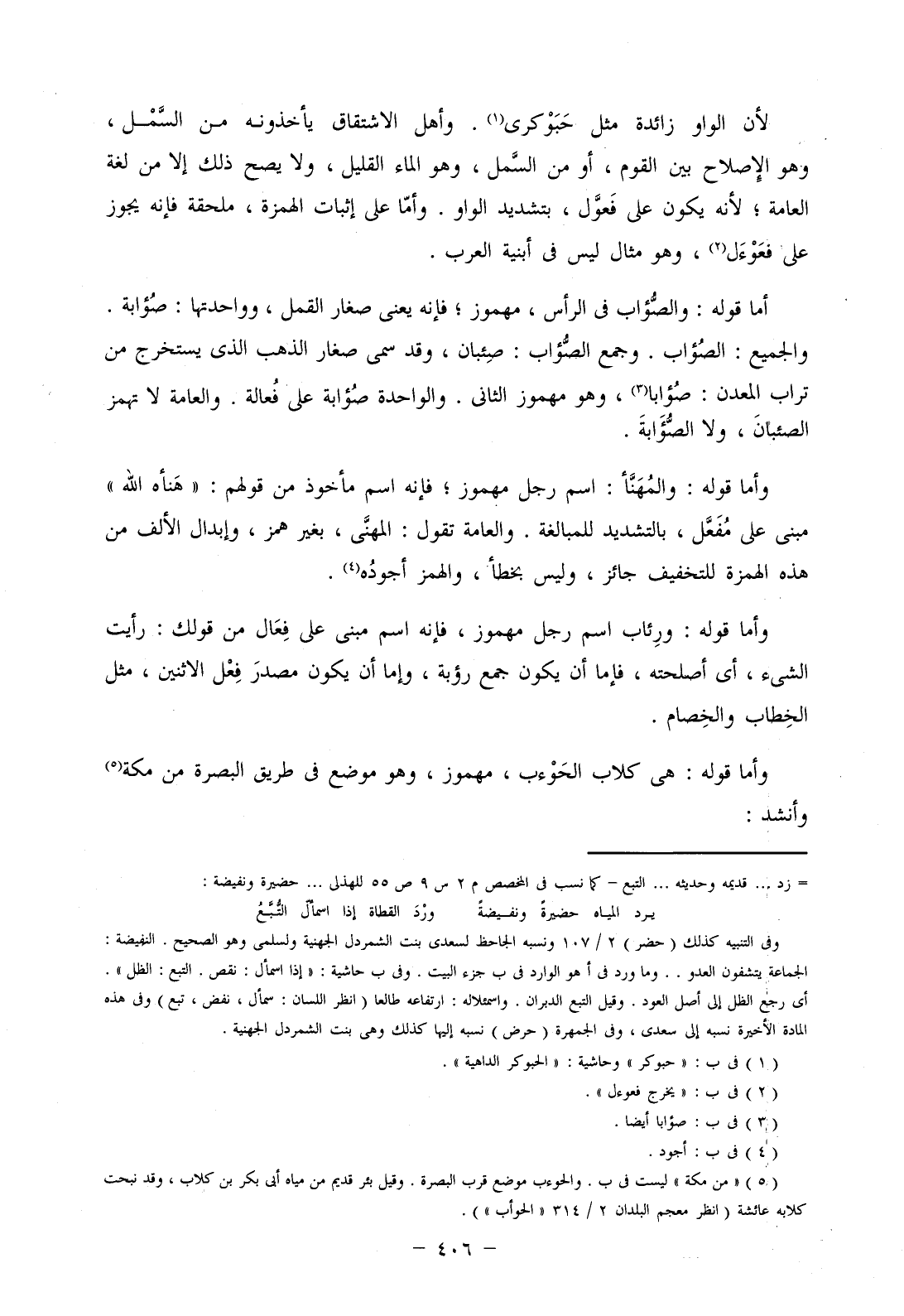 وأما قوله: والمهنأ: اسم رجل مهموز؛ فإنه اسم مأخوذ من قولهم: "هنأه الله" مبني على مفعل، بالتشديد للمبالغة. والعامة تقول: المهنى، بغير همز، وإبدال الألف من هذه الهمزة للتخفيف جائز، وليس بخطأ، والهمز أجوده.