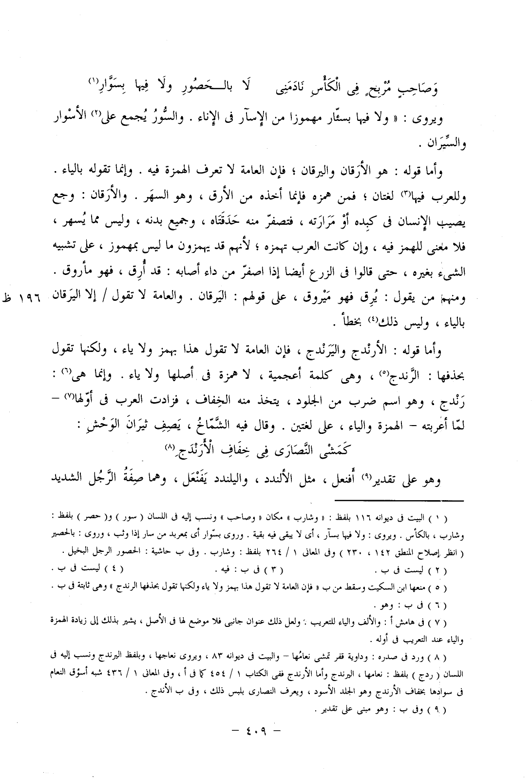 وأما قوله: الأرندج واليرندج، فإن العامة لا تقول هذا بهمز ولا ياء، ولكنها تقول بحذفها: الرندج، وهي كلمة أعجمية، لا همزة في أصلها ولا ياء. وإنما هي: رندج، وهو اسم ضرب من الجلود، يتخذ منه الخفاف، فزادت العرب في أولها- لما أعربته- الهمزة والياء، على لغتين. وقال فيه الشماخ، يصف ثيران الوحش: