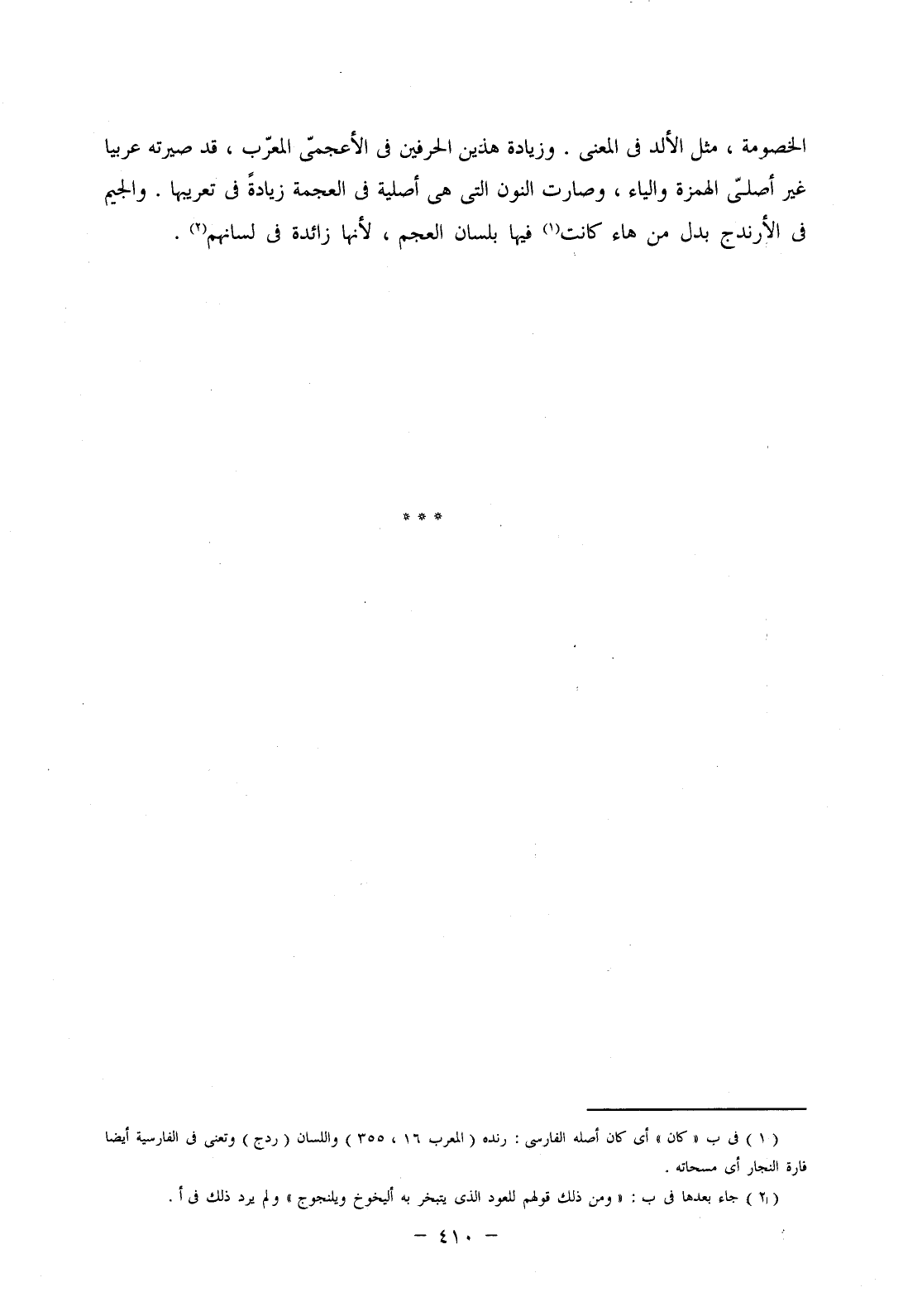 الخصومة، مثل الألد في المعنى. وزيادة هذين الحرفين في الأعجمي المعرب، قد صيرته عربيا غير أصلي الهمزة والياءن وصارت النون التي هي أصلية في العجمة زيادة في تعريبها. والجيم في الأرندج بدل من هاء كانت فيها بلسان العجم، لأنها زائدة في لسانهم.