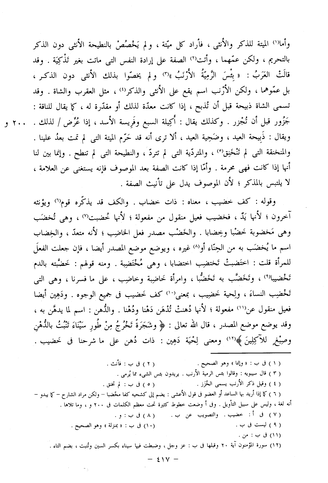 وأما الميتة للذكر والأنثى، فأراد كل ميتة، ولم يخصص بالنطيحة الأنثى دون الذكر بالتحريم، ولكن عملهما، وأتت الصفة على إرادة النفس التي ماتت بغير تذكية. وقد قالت العرب: "بئس الرمية الأرنب" ولم يخصوا بذلك الأنثى دون الذكر، بل عموهما، ولكن الأرنب اسم يقع على الأنثى والذكر، مثل العقرب والشاة. وقد تسمى الشاة ذبيحة قبل أن تذبح، إذا كانت معدة لذلك أو مقدرة له، كما يقال للناقة: جزور قبل أن تجزر. وكذلك يقال: أكيلة السبع وفريسة الأسد، إذا عرض/ لذلك. ويقال: ذبيحة العيد، وضحية العيد، ألا ترى أنه قد حرم الميتة التي لم تمت بعد علينا. والمنخنقة التي لم تنخنق، والمتردية التي لم تترد، والنطيحة التي لم تنطح. وإنما بين لنا أنها إذا كانت فهي محرمة. وأما إذا كانت الصفة بعد الموصوف فإنه يستغنى عن العلامة، لا يلتبس بالمذكر؛ لأن الموصوف يدل على تأنيث الصفة.