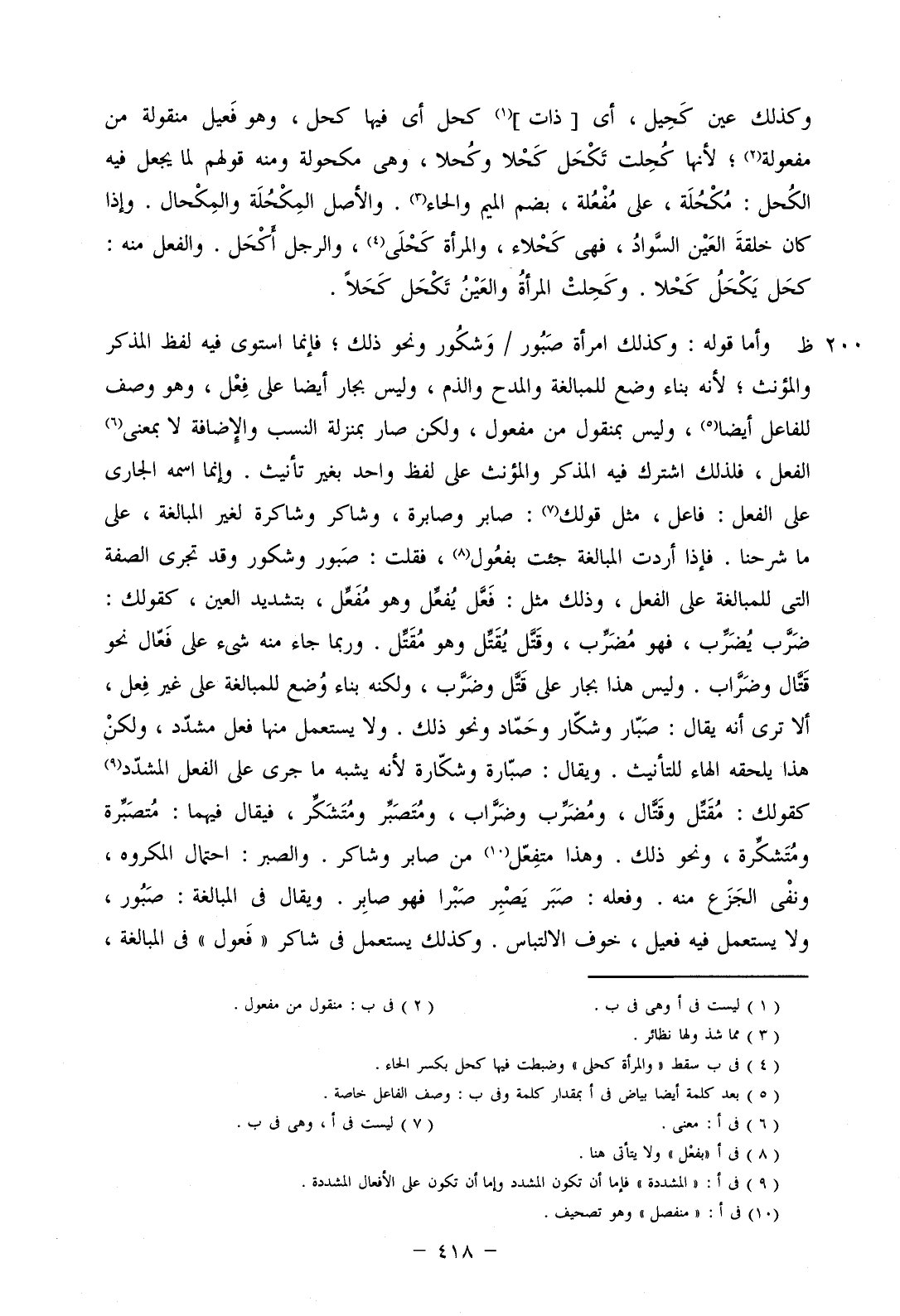 وأما قوله: وكذلك امرأة صبور/ وشكرو ونحو ذلك؛ فإنما استوى فيه لفظ المذكر والمؤنث؛ لأنه بناء وضع للمبالغة والمدح والذم، وليس بجار ايضا على فعل، وهو وصف للفاعل أيض، وليس بمنقول من مفعول، ولكن صار بمنزلة النسب والإضافة لا بمعنى الفعل، فلذلك اشترك فيه المذكر والمؤنث على لفظ واحد بغير تأنيث. وإنما اسمه الجاري على الفعل: فاعل، مثل قولك: صابر وصابرة، وشاكر وشاكرة لغير المبالغة، على ما شرحنا. فإذا أردت المبالغة جئت بفعول، فقلت: صبور وشكور وقد تجري الصفة التي للمبالغة على الفعل، وذلك مثل: فعل يفعل وهو مفعل، بتشديد العين، كقولك: ضرب يضرب، فهو مضرب، وقتل يقتل وهو مقتل. وربما جاء منه شيء على فعال نحو قتال وضراب. وليس هذا بجار على قتل وضرب، ولكنه بناء وضع للمبالغة على غير فعل، ألا ترى أنه يقال: صبار وشكار وحماد ونحو ذلك. ولا يستعمل منها فعل مشدد، ولكن هذا يلحقه الهاء للتأنيث. ويقال: صبارة وشكارة لأنه يشبه ما جرى على الفعل المشدد كقولك: مقتل وقتال، ومضرب وضراب، ومتصبر ومتشكر، فيقال فيهما: متصبرة ومتشكرة، ونحو ذلك. وهذا متفعل من صابر وشاكر. والصبر: احتمال المكروه، ونفى الجزع منه. وفعله: صبر يصبر صبرا فهو صابر. ويقال في المبالغة: صبور، ولا يستعمل فيه فعيل، خوف الالتباس. وكذلك يستعمل في شارك "فعول" في المبالغة،