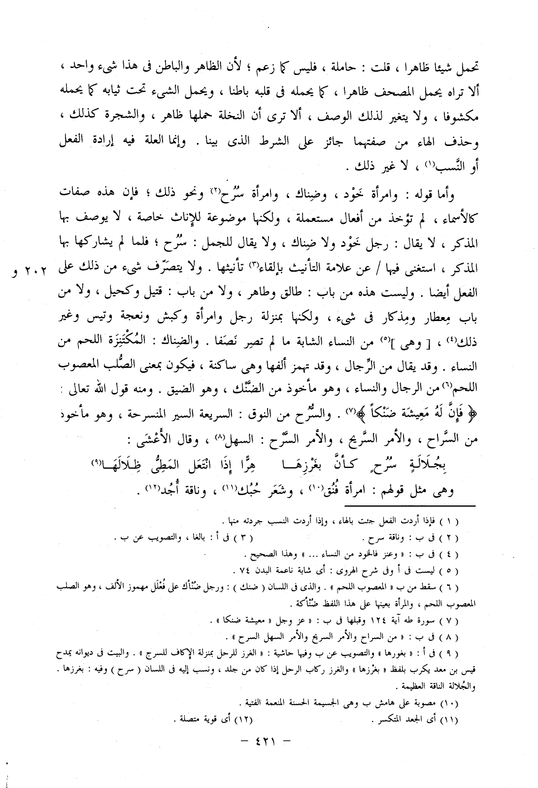 وأما قوله: وامرأة خود، وضناك، وامرأة سرح ونحو ذلك؛ فإن هذه صفات كالأسماء، لم تؤخذ من أفعال مستعملة، ولكنها موضوعة للإناث خاصة، لا يوصف بها المذكر، لا يقال: رجل خود ولا ضناك، ولا يقال للجمل: رسح؛ فلما لم يشاركها بها المذكر، استغنى فيها/ عن علامة التأنيث بإلقاء تأنيثها. ولا يتصرف شيء من ذلك على الفعل أيضا. وليست هذه من باب: طالق وطاهر، ولا من باب: قتيل وحكيل، ولا من باب معطار ومذكار في شيء، ولكنها بمنزلة رجل وامرأة وكبش ونعجة وتيس وغير ذلك، [وهي] من النساء الشابة ما لم تصر نصفا. والضناك: المكتنزة اللحم من النساء. وقد يقال من الرجال، وقد تهمز ألفها وهي ساكنة، فيكون بمعنى الصلب المعصوب اللحم من الرجال والنساء، وهو مأخوذ من الضنك، وهو الضيق. ومنه قول الله تعالى: (فَإنَّ لَهُ مَعِيشَةً ضَنكًا). والسرح من النوق: السريعة السير المنسرحة، وهو مأخوذ من السراح، والأمر السريح، والأمر السرح: السهل، وقال الأعشى: