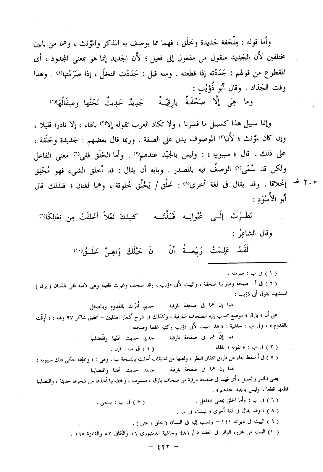 وإنما سبيل هذا كسبيل ما فسرناه، ولا تكاد العرب تقوله إلا بالهاء، إلا نادرا قليلا، وإن كان لمؤنث؛ لأن الموصوف يدل على الصفة. وربما قال بعضهم: جديدة وخلقة، على ذلك. قال "سيبويه": وليس بالجيد عندهم. وأما الخلق ففي معنى الفاعل ولكن قد سمي الوصف فيه بالمصدر. وبابه أن يقال: قد أخلق الشيء فهو مخلق إخلاقا. وقد يقال في لغة أخرى: خلق / يخلق خلوقة، وهما لغتان؛ فلذلك قال أبو الأسود: