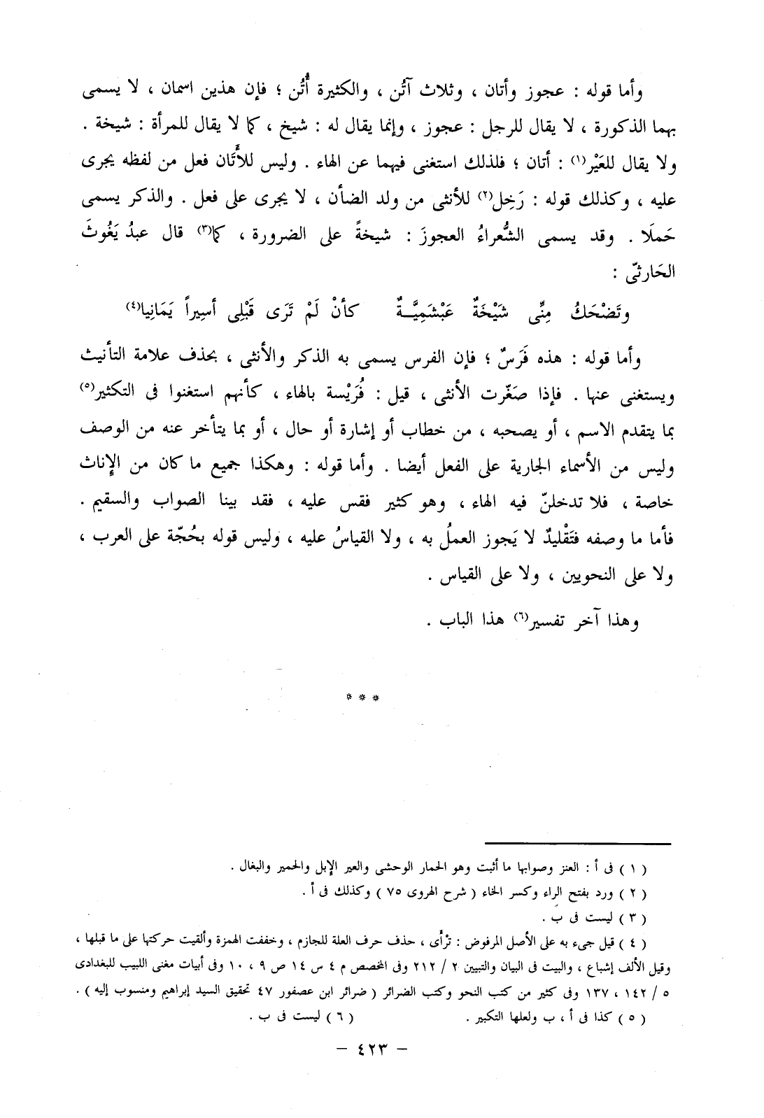 وأما قوله: هذه فرس؛ فإن الفرس يسمى به الذكر والأنثى، بحذف علامة التأنيث ويستغنى عنها. فإذا صغرت الأنثى، قيل: فريسة بالهاء، كأنهم استغنوا في التكثير بما يتقدم الاسم، أو يصحبه، من خطاب أو إشارة أو حال، أو بما يتأخر عنه من الوصف وليس من الأسماء الجارية على الفعل أيضا. وأما قوله: وهكذا جميع ماكان من الإناث خاصة، فلا تدخلن فيه الهاء، وهو كثير فقس عليه، فقد بينا الصواب والسقيم. فأما ما وصفه فتقليد لا يجوز العمل به، ولا القياس عليه، وليس قوله بحجة على العرب، ولا على النحويين، ولا على القياس.