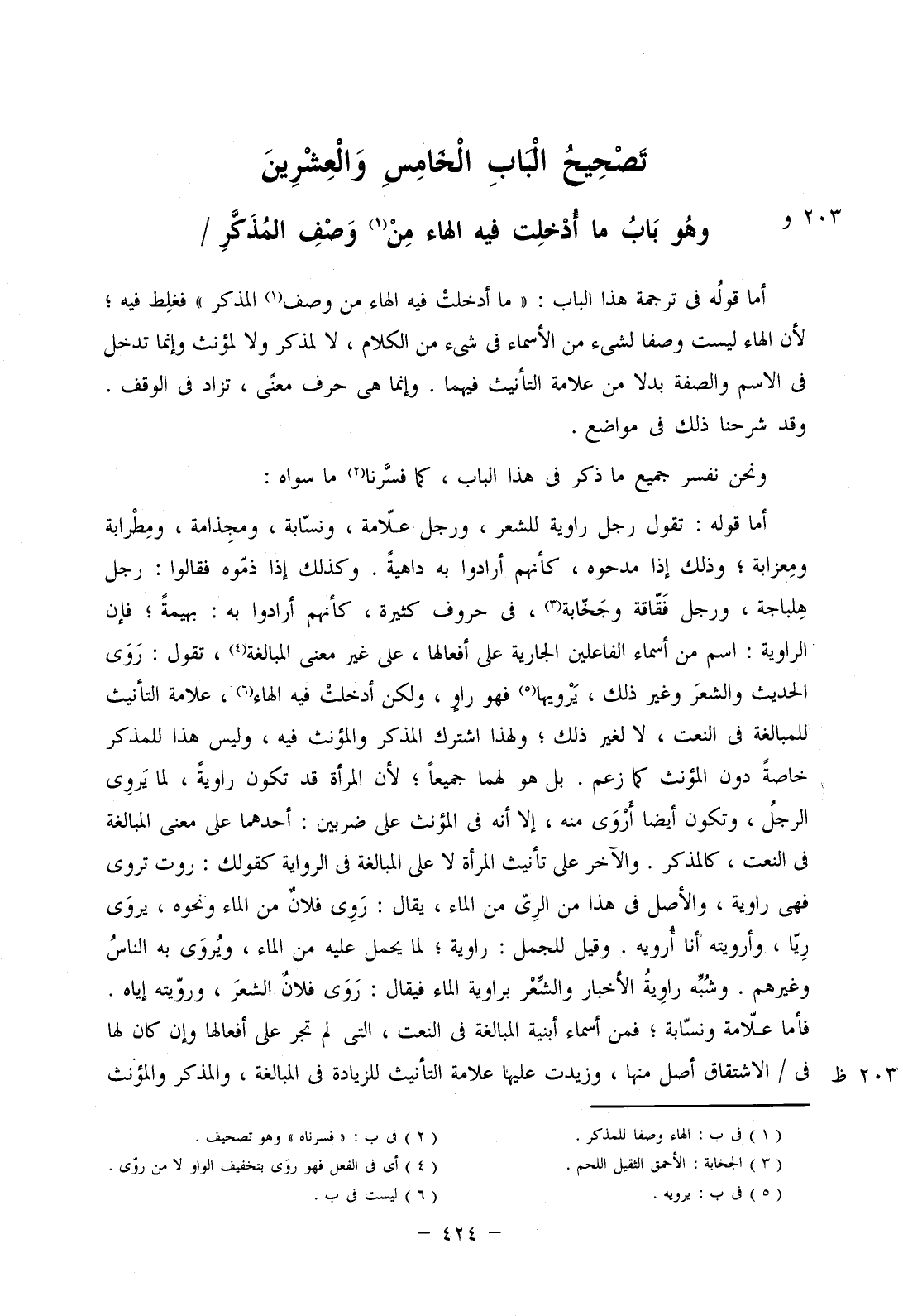 أما قوله في ترجمة هذا الباب: "ما أدخلت فيه الهاء من وصف المذكر" فغلط فيه؛ لأن الهاء ليست وصفا لشيء من الأسماء في شيء من الكلام، لا لمذكر ولا لمؤنث وإنما تدخل في الاسم والصفة بدلا من علامة التأنيث فيهما. وإنما هي حرف معنى، تزاد في الوقف. وقد شرحنا ذلك في مواضع.