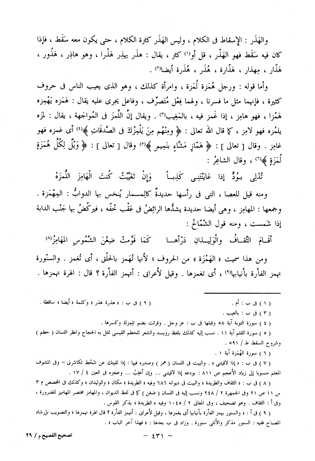 وأما قوله: ورجل همزة لمزة، وامرأة كذلك، وهو الذي يعيب الناس في حروف كثيرة، فإنهما مثل ما فسرنا، ولهما فعل متصرف، وفاعل يجري عليهن يقال: همزه يهمزه همزا، فهو هامز، إذا غمز فيه، بالمغيب. ويقال إن اللمز في المواجهة، يقال: لمزه يلمزه فهو لامز، كما قال الله تعالى: (ومِنْهُم مَّن يَلْمِزُكَ فِي الصَّدَقَاتِ) أي غمزه فهو غامز. وقال [تعالى]: (هَمَّازٍ مَّشَّاءٍ بِنَمِيمٍ) وقال [تعالى]: (وَيْلٌ لِّكُلِّ هُمَزَةٍ لُّمَزَةٍ)، وقال الشاعر: